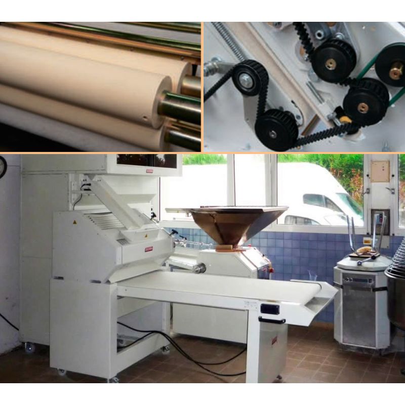 The baguette moulding machine FA 2003 TS Mecnosud (Italy) is designed to produce blanks for baguettes, loaves, braids, croissants, hot dogs, and other cylindrical dough blanks, dough ropes. Rolling of the round dough blank is carried out using 3 cylinders, and felt conveyor belts moving in different directions at different speeds form a rope-shaped blank. The width of the conveyor belts is 800 mm. The system of forming with the help of a belt. The maximum length of the blank is 70 cm.
