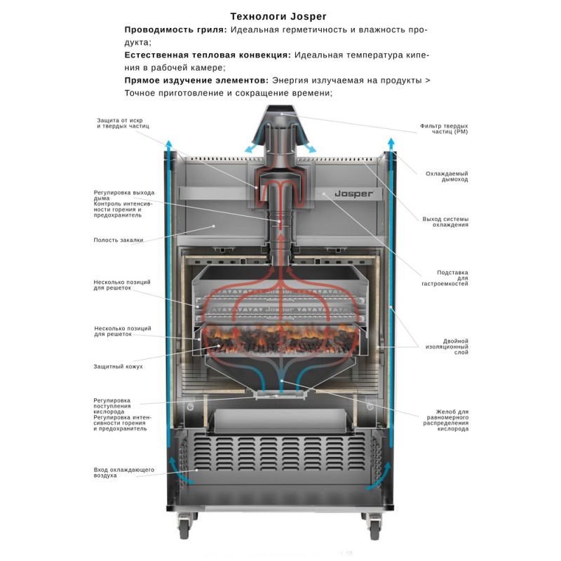 Ignition time 35 min. on average The amount of Josper coal consumed per day is 12 - 16 kg on average Autonomous operation with 1 coal load is 9 hours. Productivity per hour is 90 kg. on average. Cooking temperature 300C - 350C Oven capacity in GN trays (per 1 grill rack) 2 x GN 1/1 Equivalent power 4.5 kW Extraction capacity 33200 cubic meters/hour. Maximum smoke flow 10.5 g/sec