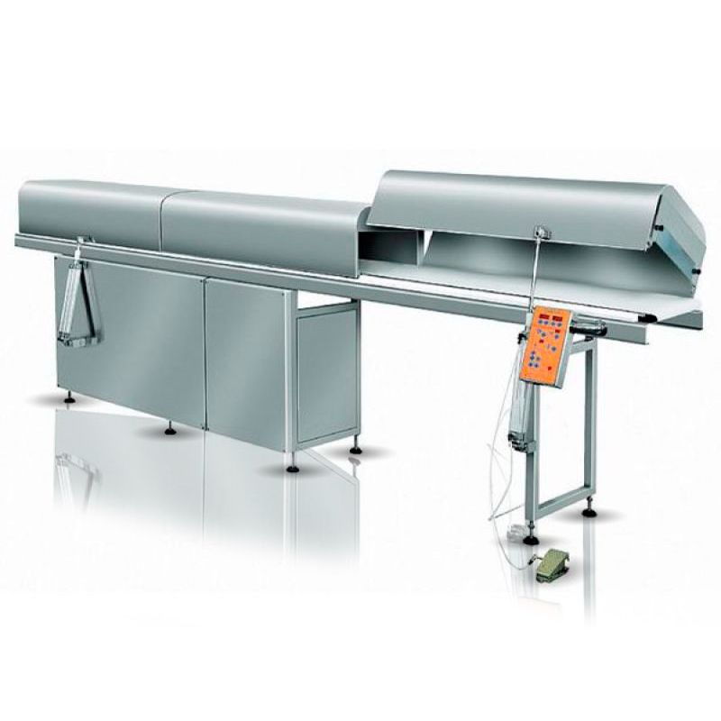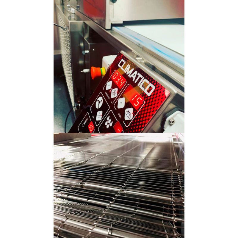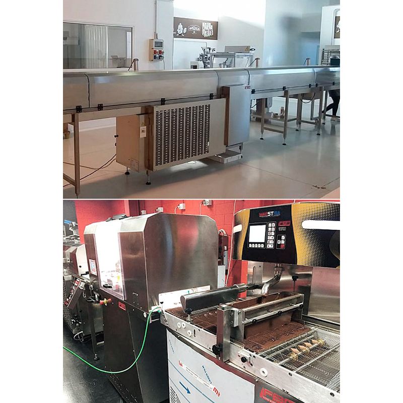 The FBM CLIMATICO cooling tunnel is designed to cool chocolate products and chocolate glaze on confectionery products after decoration. The Climatico cooling tunnel can consist of several cooling sections. The products are cooled by circulating cold air. The refrigerant used is freon R-22. Due to the reduced humidity, the cooling system ensures optimal crystallization of chocolate. The tunnel refrigeration chamber is made of stainless steel and insulated with sandwich panels. Automatic evaporator defrosting. The air circulation capacity inside the tunnel is 950 cubic meters/hour. A special conveyor movement pattern allows separating the blanks from the belt. Possibility of installing remote refrigeration (removal up to 15 m.) Equipment: polymer multilayer tape; Automatic tape centering system; tape cleaning system. Technical specifications: Tape width - 400 mm; Length of the tunnel working area - 4000 mm; Cooling capacity - 6.6 kW;Specification