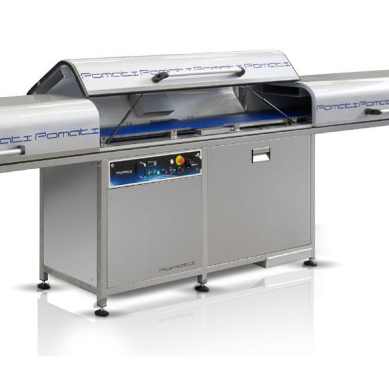 The cooling tunnel Pomati TUNNEL 320/12 is made entirely of stainless steel - stamped caps made of thermal insulation material. The conveyor belt is made of food-grade non-deformable polyurethane. The detachable table is used as the final drive station. Self-centering shafts for adjusting the direction of movement of the conveyor. Cooling by air circulation. Air-cooled refrigeration unit. Product height up to 130 mm. Conveyor width: 320 mm. The length of the cooling tunnel is 12 m.