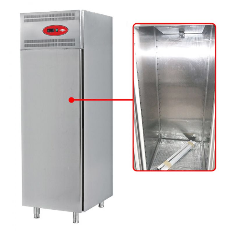 Chladicí vitrína 1dveřová Empero EMP.70.80.01 je určena pro skladování potravin ve stravovacích zařízeních, maloobchodních prostorách prodejen, skladech, technických místnostech, provozech potravinářské výroby, kulinářských dílnách. 3 police velikosti GN 2/1. Okolní teplota 43 C. Elektronická regulace teploty a odmrazování, polyuretanová izolace o tloušťce 48 mm. Samozavírací dveře.
