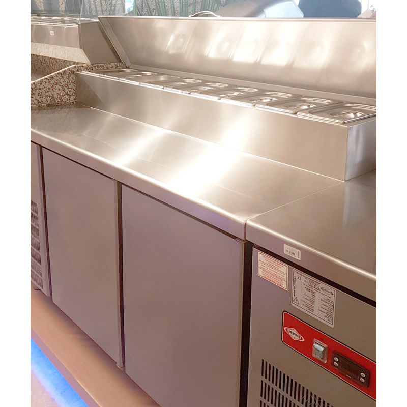 Chlazený salátový stůl Empero EMP.200.70.01-PSO šetří pracovní prostor, optimalizuje pracovní proces v profesionální kuchyni a zvyšuje rychlost práce personálu. Celkové rozměry 200*70*85 cm umožňují instalaci tohoto modelu do malých prostor. Elektronický ovládací panel umožňuje nastavit teplotní režim (provozní rozsah 0...+5 C), sledovat procesy automatizovaného odmrazování a odstraňování kondenzátu. Kapacita – 8 GN 1/4-100. Police jsou potaženy plastovou vrstvou pro zvýšení odolnosti proti opotřebení. Troje samozavírací dveře, 500 l komora.Specifikace