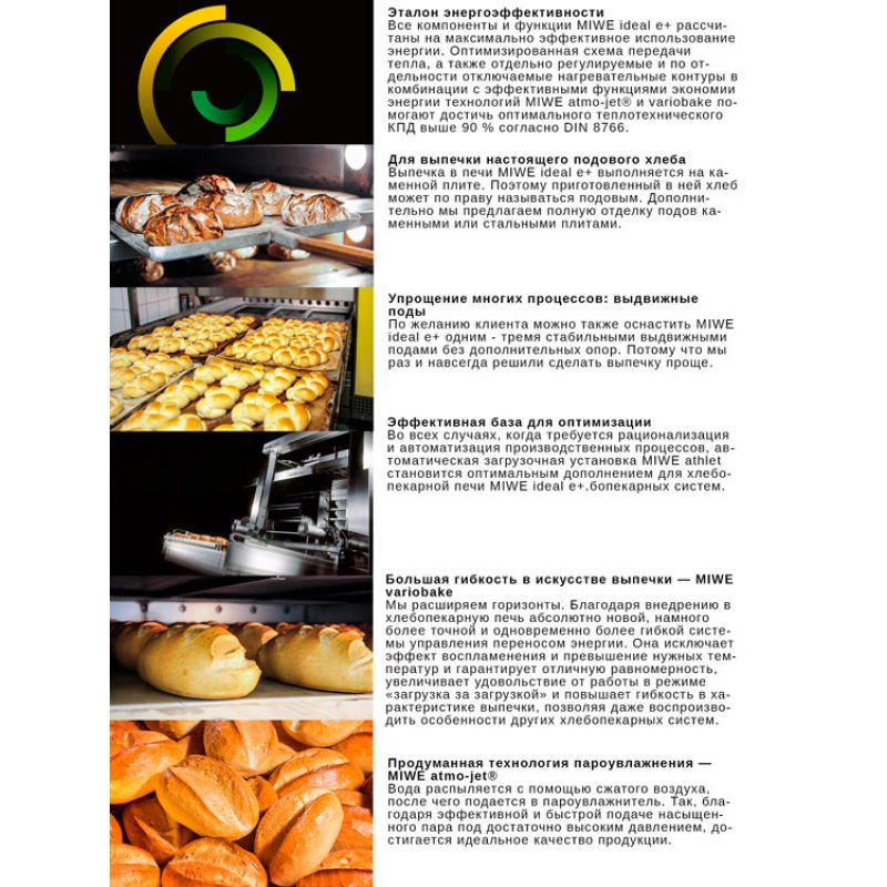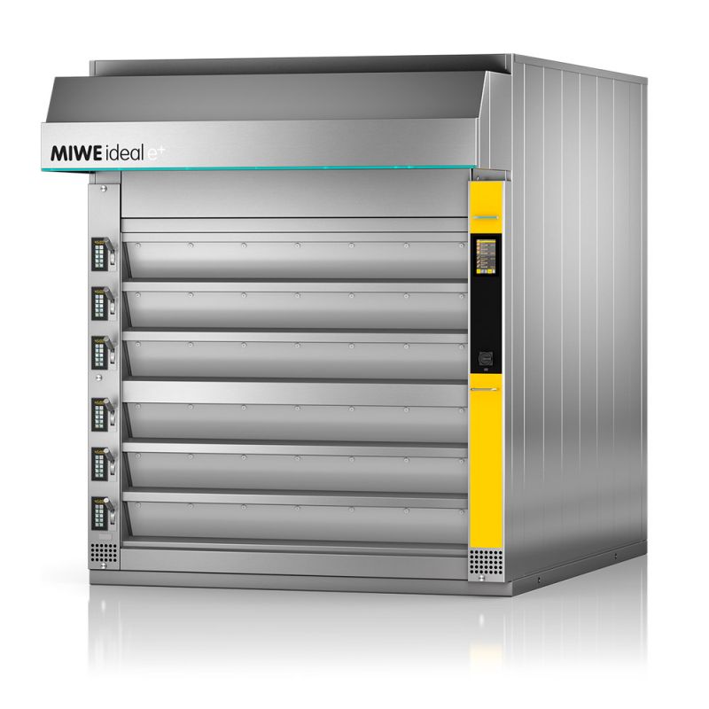 Elektrická patrová trouba bez 4-úrovňové pečicí jednotky MIWE ideal e+ Extra třída patrová trouba. Horkovzdušné oběhové čerpadlo se statickou pečící atmosférou. Ideální pro pečení celé škály pečiva – od hutného žitného chleba až po drobné pečivo z pšeničné mouky. Široká škála konstrukčních variant co do počtu topenišť, topných okruhů, výšek topenišť atd.
