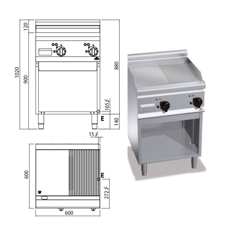 Elektrický podlahový gril Bertos E6FM6M-2 je vyroben na otevřené základně a je vybaven ocelovým grilovacím panelem s vysoce výkonnými ocelovými topnými tělesy. Se dvěma na sobě nezávislými varnými zónami a vybavenými samostatnými termostaty a pohony splňuje tato fritovací plocha všechny požadavky na potravinářské vybavení. Jedna varná zóna má žebrovaný povrch, druhá je hladká. Teplota ohřevu každého z nich je regulována termostaty se světelnými indikátory zapnutí/vypnutí. Rozsah provozních teplot je 50-300 C. Design modelu Bertos E6FM6M-2 je vyvinut tak, aby co nejvíce usnadnil čištění pracovních ploch. Pro odvod tukových odpadů je k dispozici kanál, který lze v případě potřeby uzavřít teflonovou teplotně odolnou zátkou. Drenážní kanál ústí do vyjímatelné uzavřené nádoby. Nechybí ani zábrany proti stříkající vodě.
