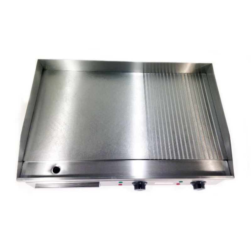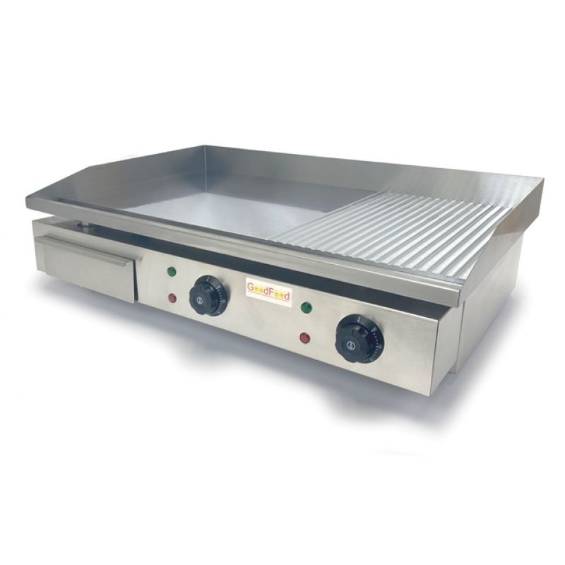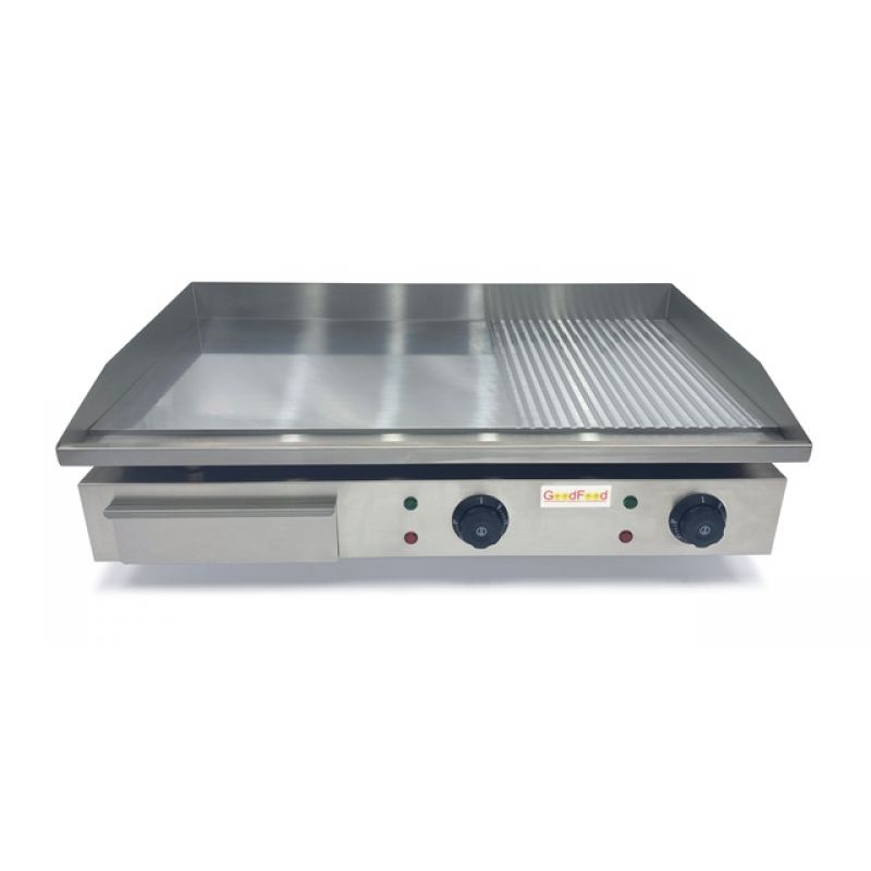 Nabízíme fritovací plochu GoodFood EG73FRM . Tato kombinovaná plocha na smažení je vyrobena z vysoce kvalitní potravinářské nerezové oceli. Jedinečný design kombinuje hladké a žebrované povrchy, což vám poskytuje maximální flexibilitu při přípravě různých pokrmů. Pochromovaná ocel se zrcadlovým povrchem zajišťuje rovnoměrné rozložení tepla a snadné čištění, díky čemuž je proces vaření ještě pohodlnější. Prostorný povrch 730 x 400 mm a dvě nezávislé varné zóny s regulací teploty od 0 do 300 C vám umožní vařit různá jídla současně, což optimalizuje váš čas a úsilí. Elektrická fritovací plocha GoodFood EG73FRM se snadno instaluje na stůl díky gumovým nožičkám, které poskytují stabilitu a ochranu pracovní plochy. Dodává se bez zástrčky, což vám umožní vybrat si nejvhodnější možnost připojení. Kompaktní rozměry balení (800x530x270 mm) a hmotnost 28 kg zajišťují snadnou přepravu a skladování.Specifikace