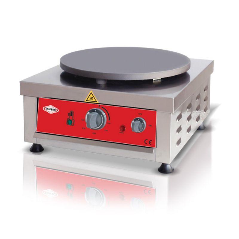 Podávejte čerstvé, lahodné palačinky přidáním elektrického lívanečníku Empero EMP.KR.010 do své řady zařízení. Protiskluzové nožičky zajistí, že zařízení během vaření neklouže a nepoškrábe vaši pracovní desku. Zařízení je navíc vybaveno snadno ovladatelným termostatem, který umožňuje nastavit požadovanou teplotu pouhým otočením knoflíku. Vyrobeno z nerezové oceli pro snadné čištění a údržbu. Talíř o průměru 400 mm je vyroben z odolné litiny s nepřilnavým povrchem, aby vaše palačinky byly dokonale zlaté, aniž by se přilepily.