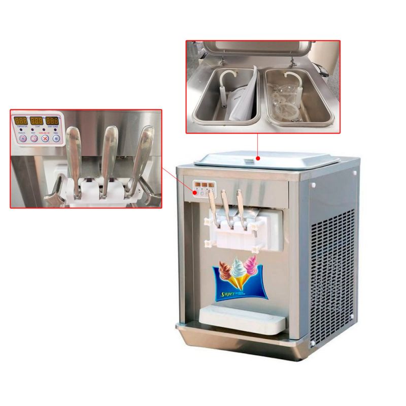 Stolní mrazák na měkkou zmrzlinu pro 3 příchutě (2 homogenní a 1 smíšená) se systémem předchlazení, kompletní se vzduchovým čerpadlem, výkon - 11-16 kg/hod, chladicí kompresor Embraco, možnost mytí, počítadlo počtu prodaných sklenic, 2 nádrže o objemu 7 litrů, chladivo R404A. Hmotnost 108 kgSpecifikace