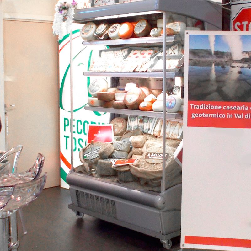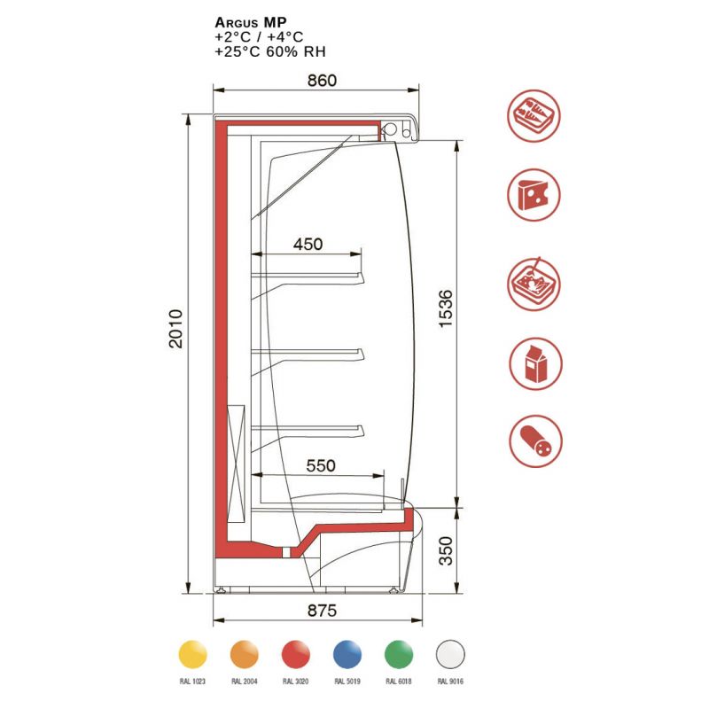 Snímek OSCARTIELLE Argus MP . Nástěnná chlazená vitrína určená pro skladování a prodej čerstvých, balených potravin. Instaluje se ve výšce 35 cm od podlahy. Vitrínu lze instalovat do jedné řady s ostatními vitrínami, navíc je vybavena panoramatickými bočními stěnami. Dodává se s vestavěným nebo vzdáleným kompresorem. Další možnosti: osvětlení police, noční roleta, držáky cenovek z hliníku a plastu, díly a bočnice z drátu nebo skla.
