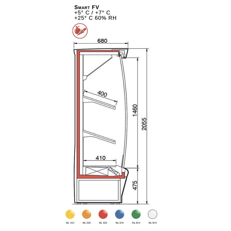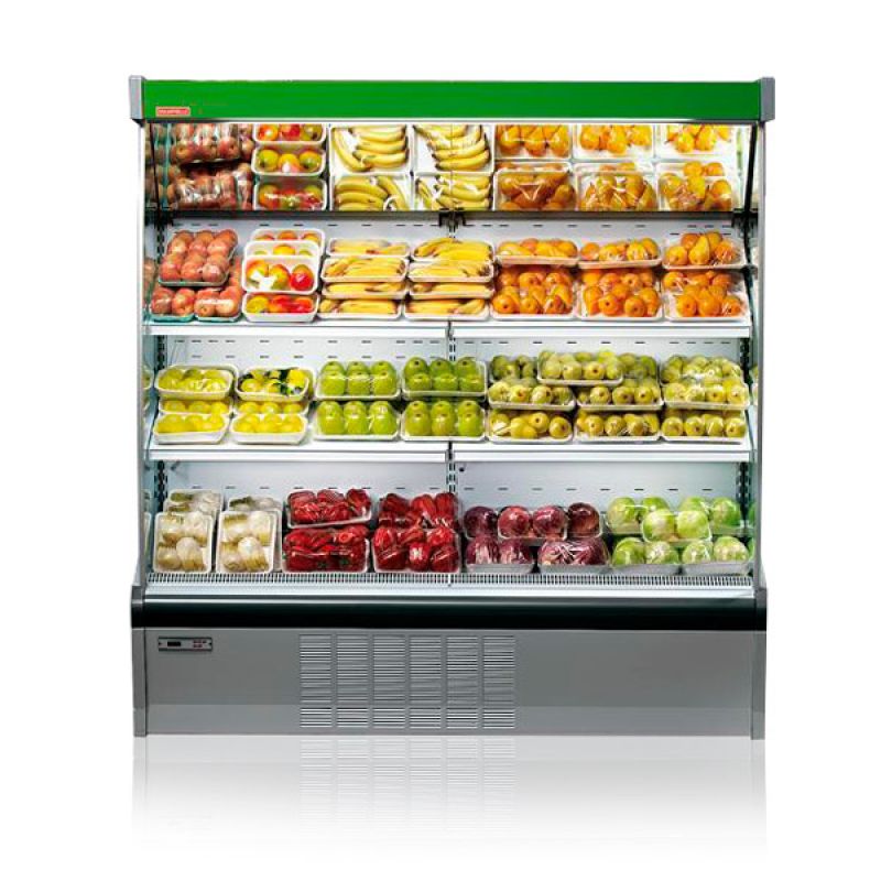 Snímek OSCARTIELLE Smart FV . Připojená chlazená vitrína určená pro skladování a prodej čerstvých, balených potravin. Vitrínu lze instalovat do jedné řady s ostatními vitrínami, navíc je vybavena panoramatickými bočními stěnami. Dodává se s vestavěným nebo vzdáleným kompresorem. Další možnosti: osvětlení police, noční roleta, držáky cenovek z hliníku a plastu, díly a bočnice z drátu nebo skla.