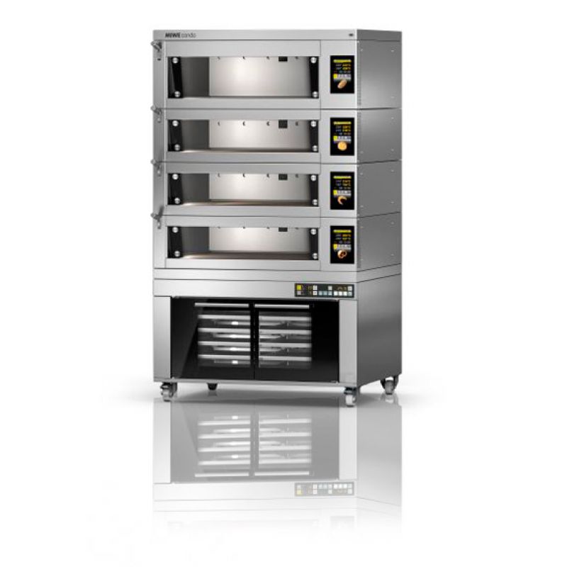Patrová pec MIWE condo 4.1208 s kynovací skříní - 4 patra 1200x800, kynovací skříň 10 vodítek 600x400 zaručuje bezkonkurenční výsledky v profesionálním pečení - pouze na minimální instalační ploše. Elektricky vyhřívaná patrová trouba s klidnou atmosférou pečení pro prvotřídní výsledky v celém sortimentu: od jemného pečiva a klasických rohlíků až po hutné chleby – ani pečeně nemají konkurenci. V modulárním provedení je nabízen pro různé výrobní kapacity v několika variantách instalační plochy a celkové pečící ploše od 0,24 do 8,64 m2. Se samostatným nastavením horního a spodního ohřevu pro každé ohniště. Referenční měřítko mezi pekařskými pecemi, vysoce ceněné po celém světě a používané v prvotřídních pekárnách a jejich pobočkách, cukrárnách, hotelech a restauracích i cateringových společnostech.
