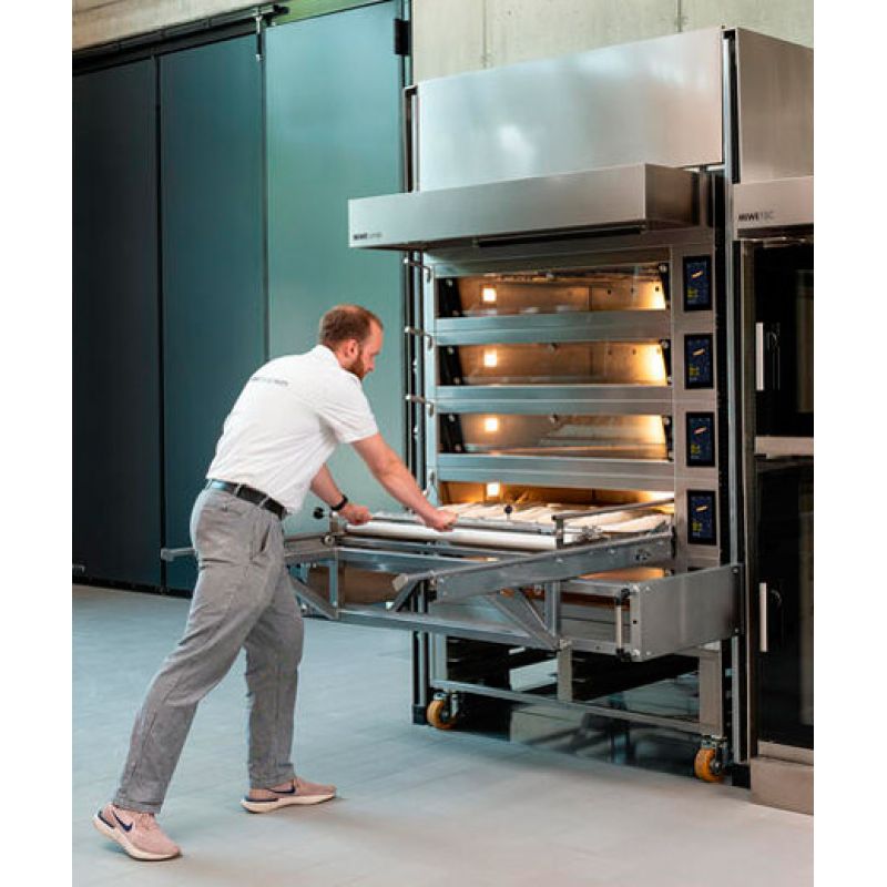 Dna bytových kamen MIWE jsou obložena odolnými kamennými deskami. To vám umožní vytvořit požadovaný teplotní režim. Práce pekaře by mohla být mnohem jednodušší: nakládání a vykládání pecí včetně horních zvládnete díky vestavěnému nakladači jedním pohybem ruky. Pro nakládání lze stahovák upevnit v ergonomicky vhodné výšce.
