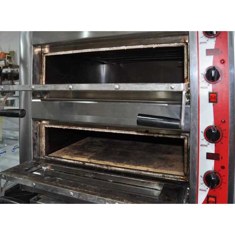 Nastavitelný horní a spodní tepelný výkon, kamenná základna pro rovnoměrné vaření, vnitřní rozměry 620x620x174mm kapacita 4+4 pizzy průměr 300 mm