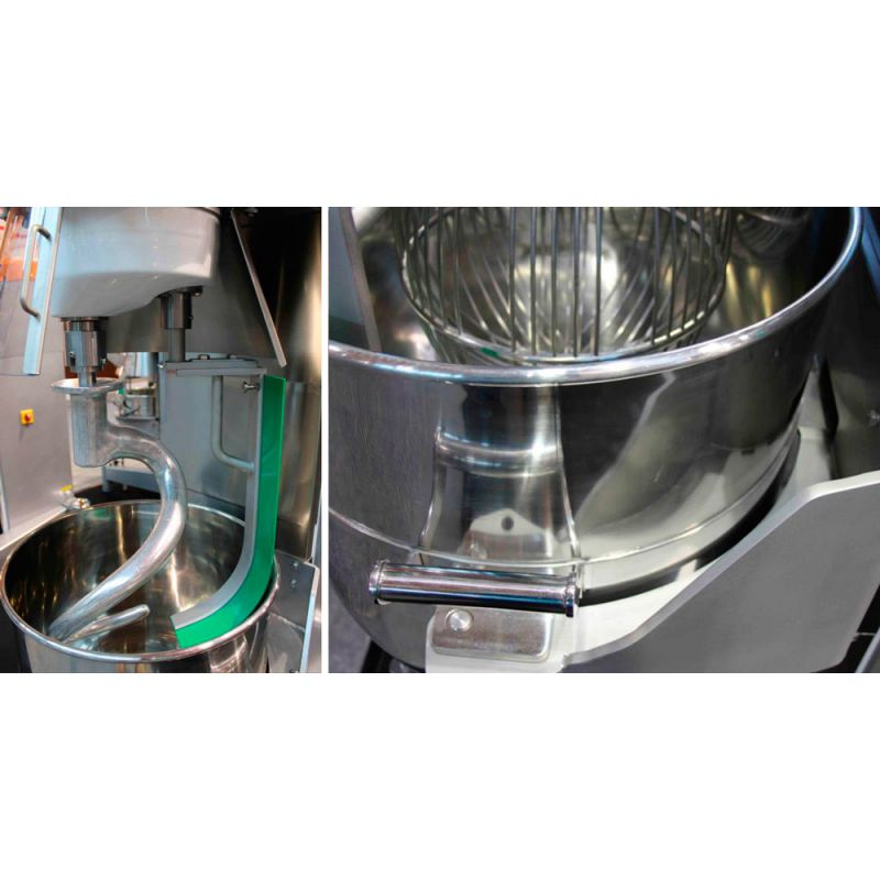 Průmyslový planetový mixér PL100N3AF plní různé funkce v profesionální kuchyni. Tento model má pohodlné víko vyrobené z potravinářského plastu, které se vyznačuje uzamykacím mechanismem pro ochranu. Sada obsahuje hliníkové nástavce - špachtle, háček a šlehací metla. Ten lze na zakázku vyrobit ve dvou provedeních – průměr tyče 4 mm nebo 6 mm. Objem mísy je 100 litrů, automatický systém zvedání a spouštění mísy. Na přání lze objednat misku bez koleček. Ovládací panel s přepínačem rychlosti, elektromechanický.