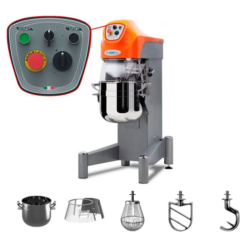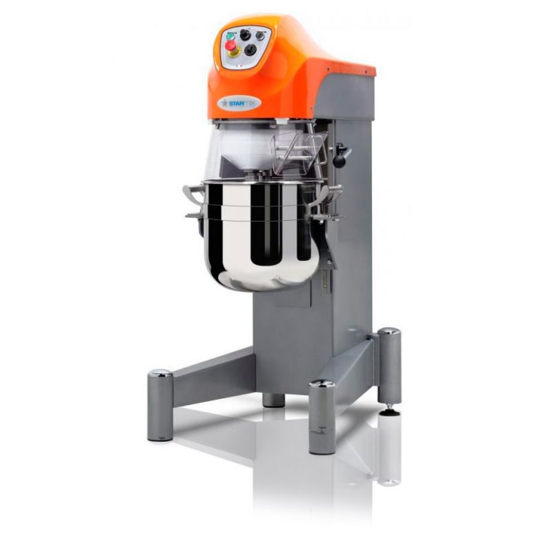 Planetární mixér PL30N3F je průmyslový model a vyrábí ho společnost Starmix pro stravovací zařízení a profesionální kuchyně všech velikostí. Vysoký výkon tohoto modelu je dosažen díky vysokému výkonu a spolehlivé montáži. Standardní balení obsahuje sadu tří nástavců: hliníkový hák, stěrku a šlehací metlu s volitelným průměrem tyče 3 mm nebo 6 mm, k dispozici na vyžádání. Víko je vyrobeno z bezpečného plastu a je vybaveno funkcí ochranného zamykání. Tři rychlostní režimy – 90, 198 a 362 ot./min. Objem mísy: 30 l.