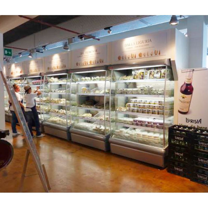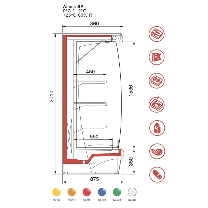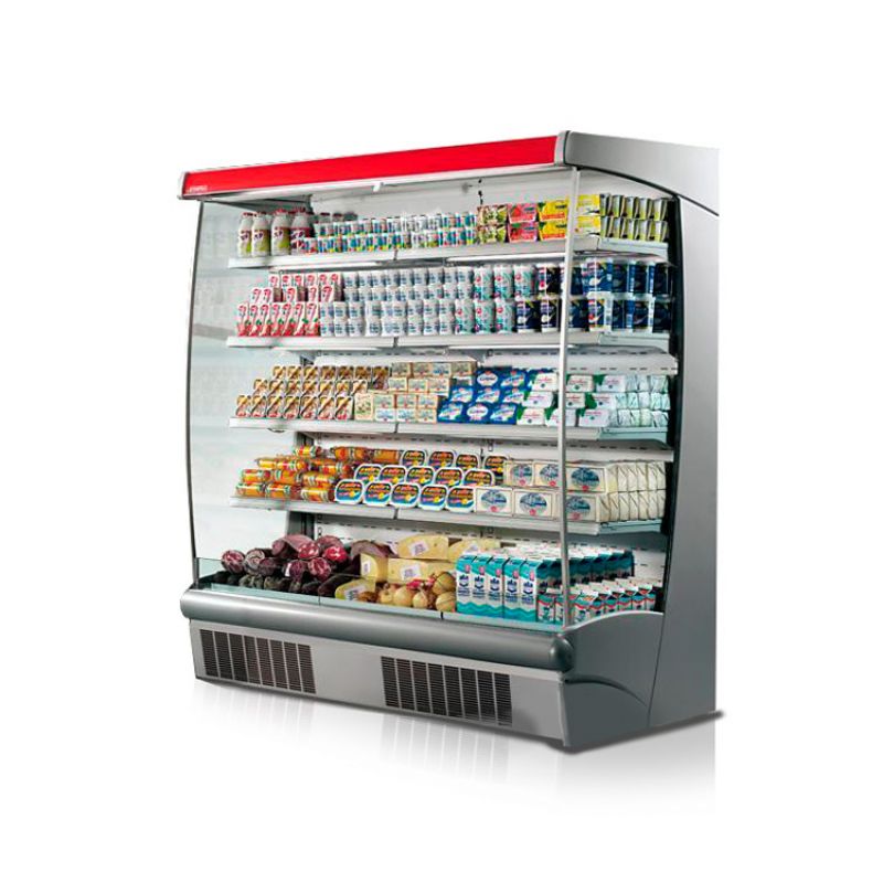 Snímek OSCARTIELLE Argus XP . Nástěnná chlazená vitrína určená pro skladování a prodej čerstvých, balených potravin. Instaluje se ve výšce 35 cm od podlahy. Vitrínu lze instalovat do jedné řady s ostatními vitrínami, navíc je vybavena panoramatickými bočními stěnami. Dodává se s vestavěným nebo vzdáleným kompresorem. Další možnosti: osvětlení police, noční roleta, držáky cenovek z hliníku a plastu, díly a bočnice z drátu nebo skla.