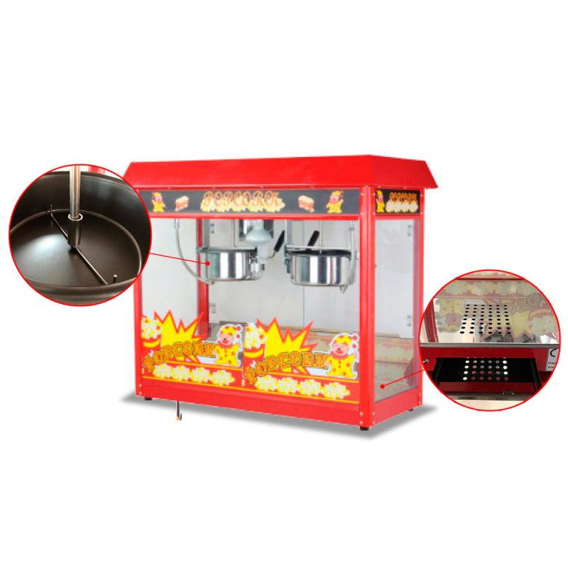 Stroj na popcorn Altezoro KZ-VUV6G-2 spojuje všechny výhody tohoto typu zařízení. Je vyroben z lakovaného kovu a průhledného polykarbonátu, je energeticky účinný a bezpečný. Produktivita 1 porce/2 minuty. Ideální pro snack bary, kina a zábavní podniky. Stolní model se dvěma nádobami na popcorn. Vnitřní osvětlení.