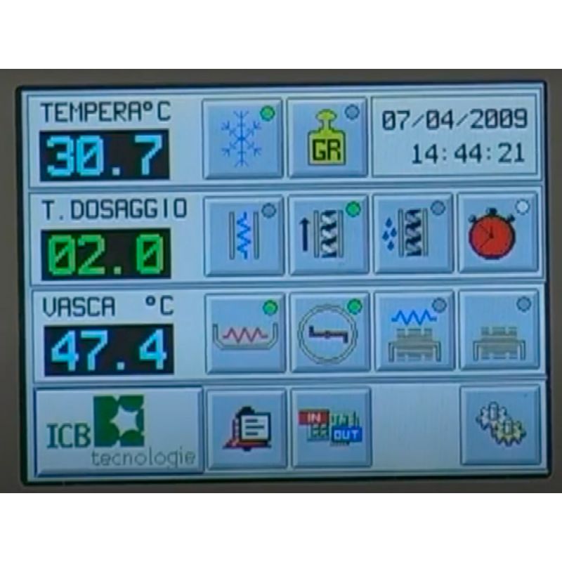 Stolní temperovací stroj ICB Chocotemper 24 je vhodný pro použití v cukrárnách, zmrzlinárnách, restauracích a hotelech. Zajišťuje jednotnou konzistenci rozpuštěné čokolády. Podlahové modely temperovacích strojů jsou určeny pro použití v cukrárnách a čokoládovnách. Ovládání a správa se provádí pomocí panelu dotykové obrazovky. Tělo a šnek jsou vyrobeny z nerezové oceli. Temperovací stroj ICB Chocotemper 24 pracuje na principu tavení a chlazení čokolády. Temperovací stroj Chocotemper 24 je vybaven: • elektronický pedálový dávkovač, který zajišťuje rovnoměrné ukládání čokolády do forem, • dva samostatné motory pro vanu a šnek, • pohotovostní režim pro udržení tekutého stavu čokolády připravené přes noc, • systém obrácení posuvu šneku, • vypínací systém s možností uložení programů pro každý druh čokolády. Temperovací stroj Chocotemper 24 může být vybaven vyhřívaným vibračním stolem a glazovacím dopravníkem na cukrovinky a pralinky.Specifikace