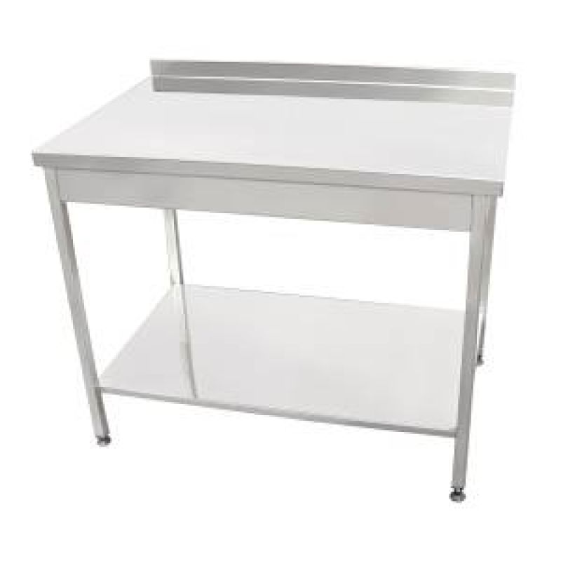 Výrobní stůl s bočnicí a policí 1600x700x850 mm.Deska stolu s bočnicí a spodní policí je celá vyrobena z nerezové oceli.