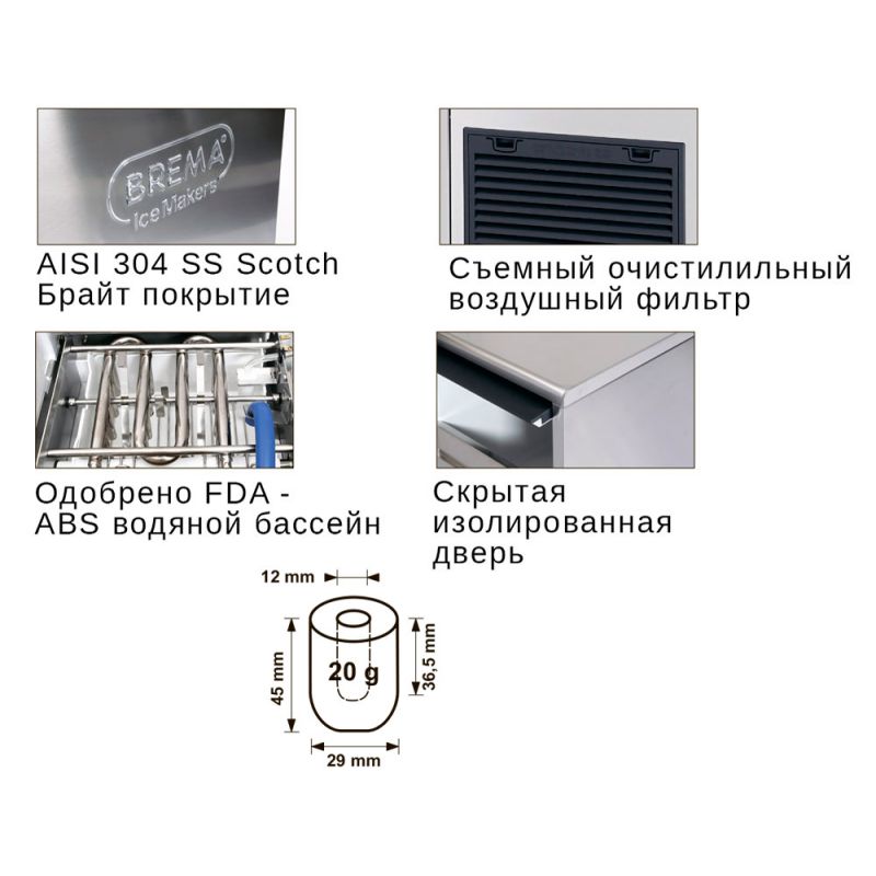 Hlavní charakteristiky Výrobník ledu BREMA IMF58A. Barva těla - Šedá, Čistá hmotnost, kg - 54, Materiál těla - Nerez, Napájecí napětí, V - 220, Napájení - Elektřina, Připojení na vodovod - Jíst, Tvar ledu - Prst, Typ chlazení - Vzduch, Typ zařízení - Výrobník ledu, Velikost - 500x580x910, Velikost ledu - 20 gr, Vestavěný úložný prostor, kg - 20, Výkon - 50 kg/den, Výkon, kW - 0,42, Záruční doba, měsíce - 12, Země původu - Itálie, další specifikace po telefonu: +38(067) 5710158.