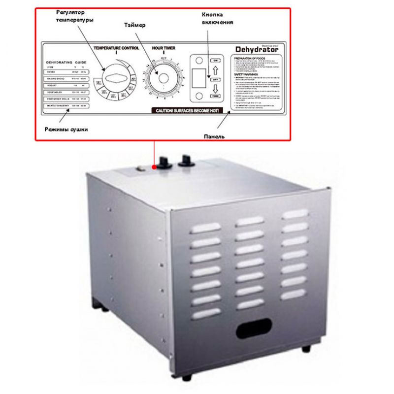 Direct blowing fan. The delivery set includes 10 shelves-grilles, permissible load per shelf up to 0.5 kg of product. Stainless steel. Overheating protection. Mechanical control. Thermostat. Operating temperature 30-75 degrees. 12-hour timer. Weight 12.7 kgSpecification