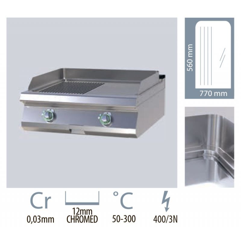Electric frying surface RM GASTRO FTHR 708 E Smooth + ribbed, tabletop, surface material - stainless steel. 1/2 smooth 1/2 ribbed surface . For installation on a bridge or on a table . Excellent thermal conductivity of the surface . Size 800 x 730 x 300 mm. Weight 72.2 kg. Power 9 kW. Working surface 560x770 mm. Temperature +50…+300 C. Connection 380 V.