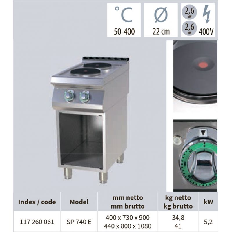 Electric stove RM GASTRO SP 740 E Floor-standing, 2-burner, round burners, the power of each burner is 2.6 kW, the diameter of the burners is 220 mm. Cooking hob 2 x 2.6 kW on a stand , the presence of doors is optional . Internal thermostatic protection of each burner . Recess against overflow . Dimensions 400 x 730 x 900 mm. Weight 34.8 kg. Power 6.2 kW. Temperature range +50 ... + 300 C. Connection 380 V.