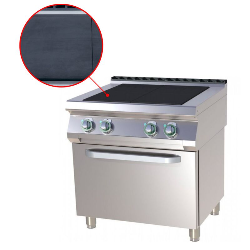 Electric stove RM GASTRO SPLT 780/11 E Floor-standing with oven, 4-burner, square solid burners, power of each burner 3 kW, burner size 300*300 mm. Solid surface 4 x 3 kW , folding panel , which ensures ease of maintenance . Power control is provided by adjusting the 6- position switch handle . Electric oven 4x GN 1/1 with convection . Heat treatment . Dimensions 800 x 730 x 900 mm. Weight 122.9 kg. Power 15.1 kW. Temperature range +50…+300 C. Connection 380 V.