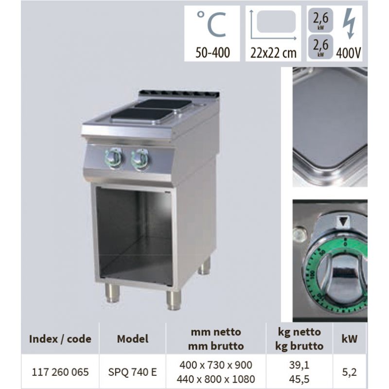 Electric stove RM GASTRO SPQ 740 E Floor, 2-burner, square burners, power of each burner 2.6 kW, burner size 220 * 220 mm. Cooking stove 2 x 2.6 kW on a stand , doors optional . Internal thermostatic protection of each burner . Recess against overflow . Size 400 x 730 x 900 mm. Weight 39.1   kg. Power 5.2 kW. Temperature range +50…+300 C. Connection 380 V.