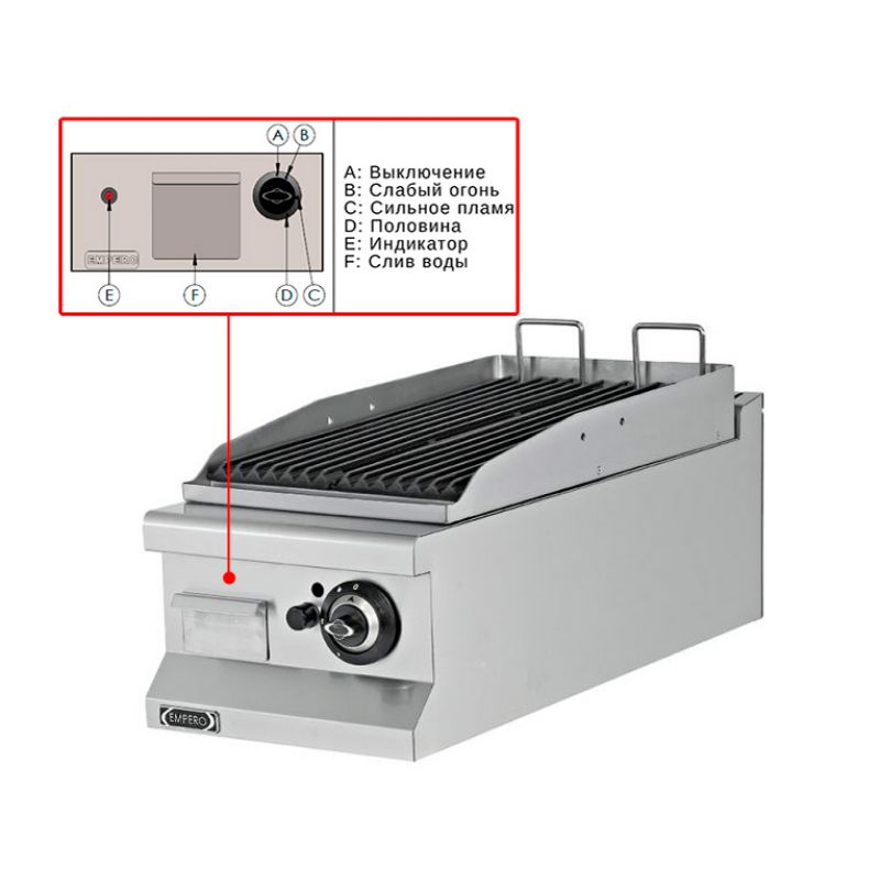 Main characteristics Empero EMP.7LG010 Lava Gas Grill. Availability of side - Eat, Body color - Grey, Body material - Stainless steel, Country of origin - Türkiye, Equipment type - Lava grill, Grease collector - Yes, Installation type - Desktop, Net weight, kg - 45, Number of posts - 1, Power supply - Gas, Power, kW - 8.6, Size - 400x700x285, Surface type - Lattice, Warranty period, months - 12, Work surface material - Stainless steel, other specifications by phone: +38(067) 5710158.