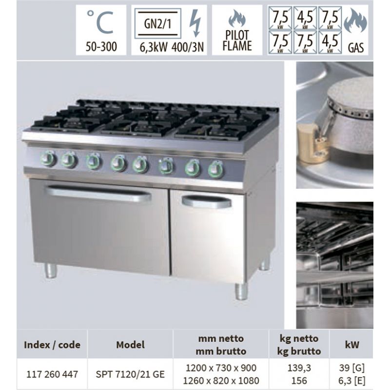 Gas stove RM GASTRO SPT 7120/21 GE floor with electric oven, 6-burner. Burner power: (2*4.5)+(3*7.5) kW. Triple hob 2 x 4.5 + 4 x 7.5 kW . Durable cast iron burners of high power . Electric oven GN 2/1 with static heat treatment . Size 1200 x 730 x 900 mm. Weight 139.3 kg. Power 39 [G] kW, 6.3 [E] kW.
