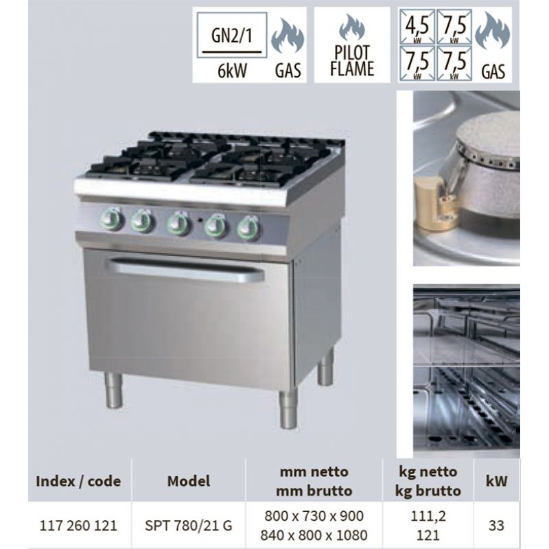 Gas stove RM GASTRO SPT 780/21 G Floor-standing with gas oven, 4-burner. Burner power: 4.5+(3*7.5) kW. Double hob with durable high-power cast iron burners 1 x 4.5 + 3 x 7.5 kW . Overflow recess . Gas oven GN 2/1 with static heat treatment . Dimensions 800 x 730 x 900 mm. Weight 112 kg. Power 33 kW.