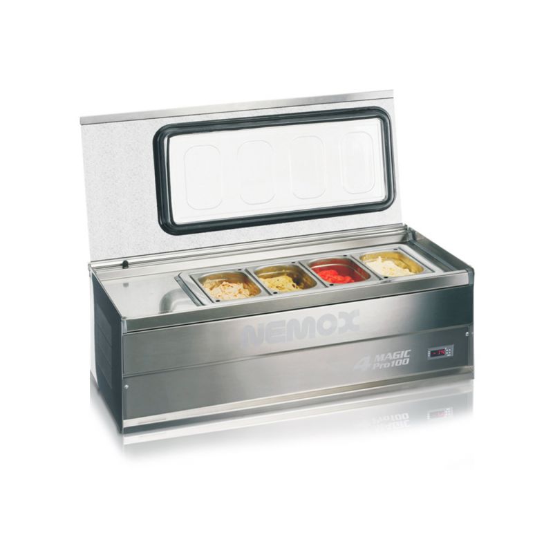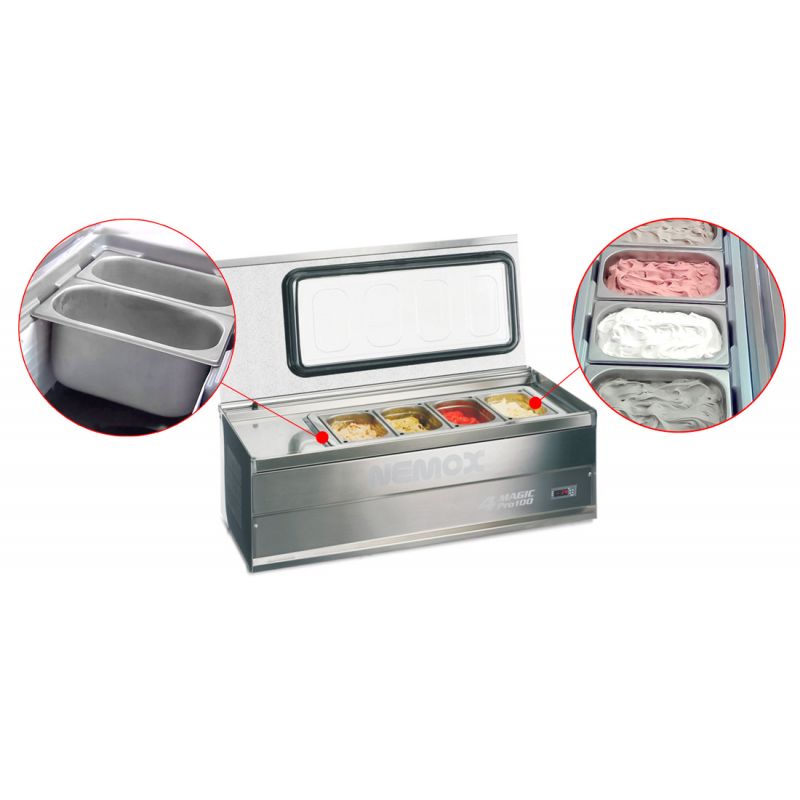 The Nemox 4Magic PRO 100 ice cream display case is a unique glass ice cream storage chamber designed for restaurants and bars. Maintains the ideal temperature in ice cream, ice cream yogurt, sorbetti. The 4Magic PRO100 can be used together with any professional NEMOX freezer, thus creating a NEMOX ice cream parlor system. You can prepare ice cream or sorbetti, store and serve it like in a real ice cream parlor. All in one small space!