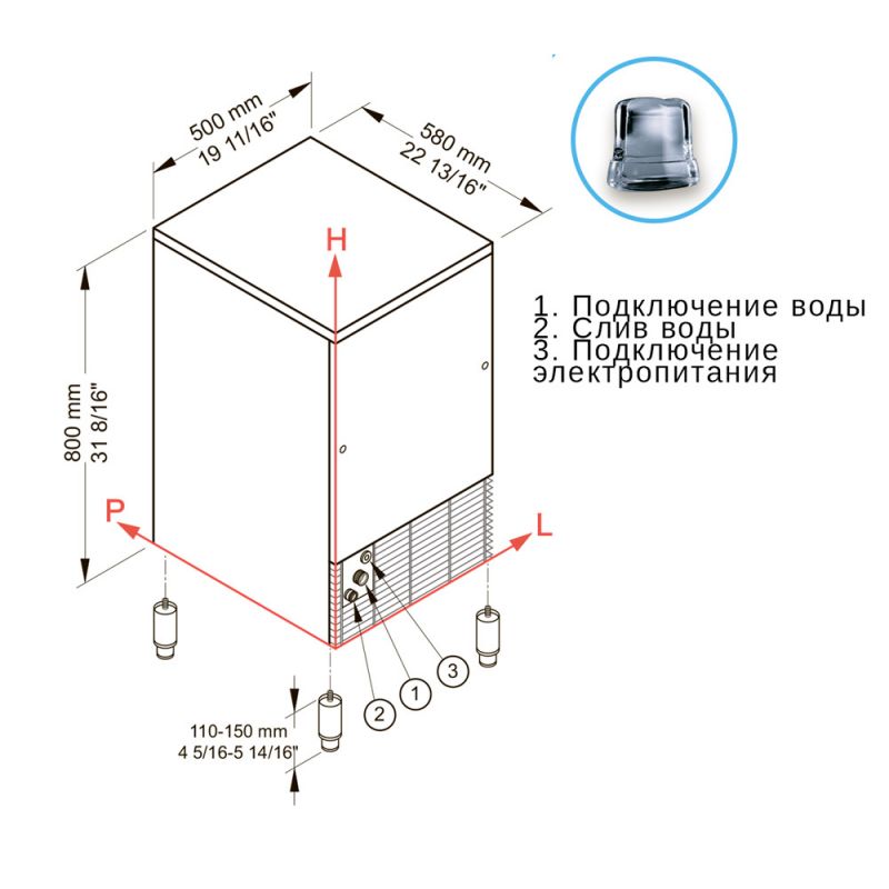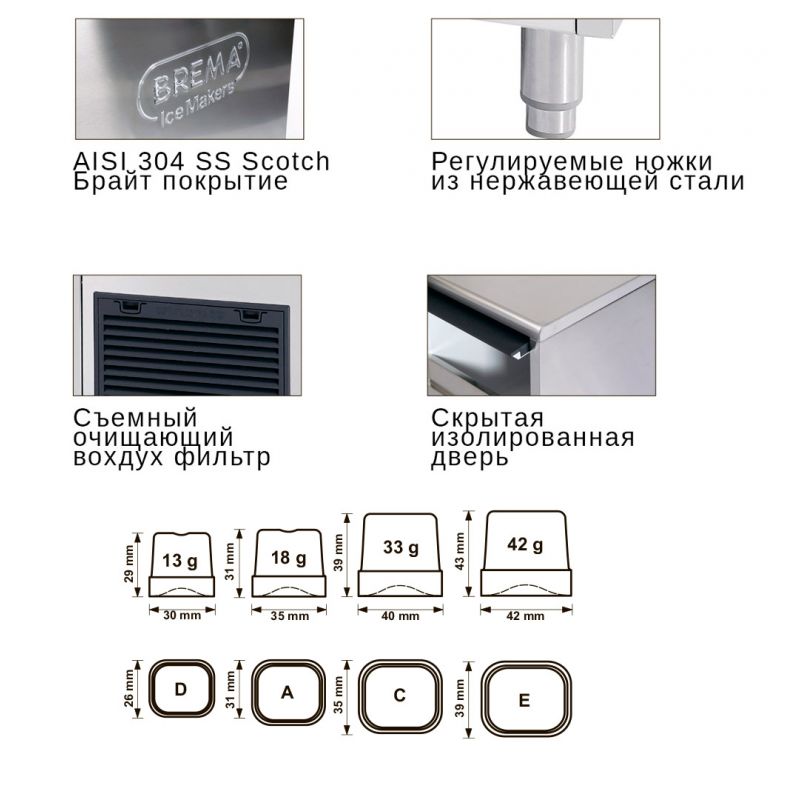 Main characteristics Ice maker BREMA CB425A. Body color - Grey, Body material - Stainless steel, Built-in storage, kg - 25, Connection to the water supply - Eat, Cooling type - Air, Country of origin - Italy, Equipment type - Ice maker, Ice shape - Cube, Ice size - 18 gr, Net weight, kg - 56, Performance - 47 kg/day, Power supply - Electricity, Power, kW - 0.5, Size - 500x580x910, Supply voltage, V - 220, Warranty period, months - 12, other specifications by phone: +38(067) 5710158.