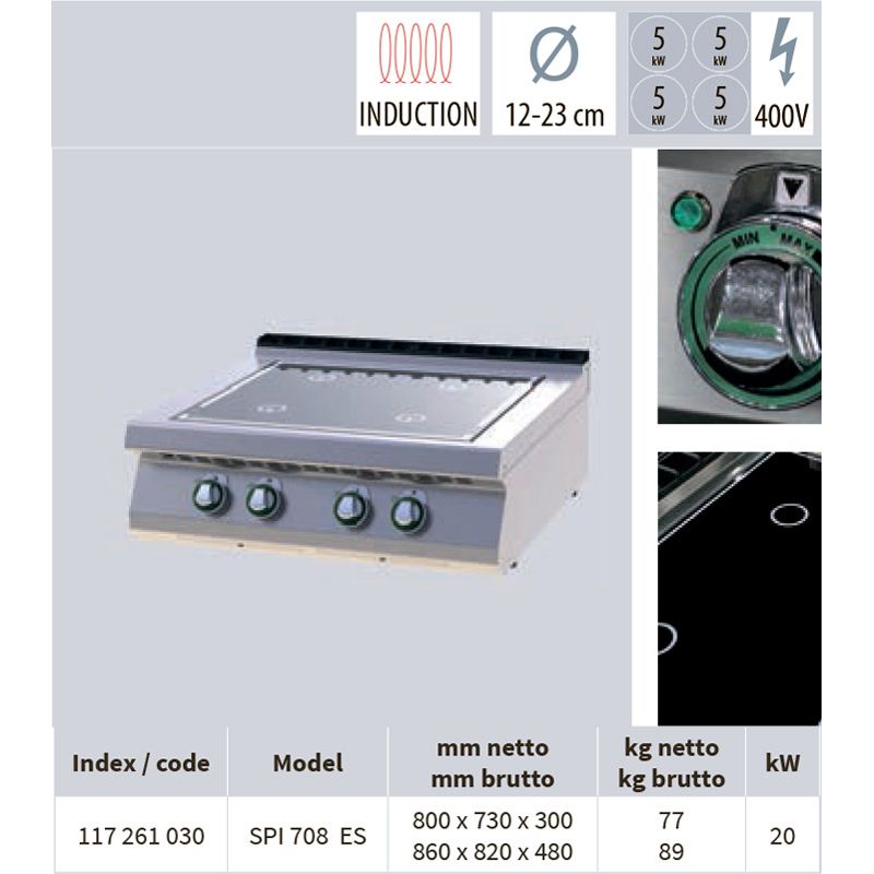 Induction cooker RM GASTRO SPI 708 E tabletop, 4 burners of 3.5 kW. Heating zone diameter 120 - 230 mm. Double induction burner . Induction components manufactured by Berner. High efficiency and speed of operation . Dimensions 800 x 730 x 300 mm. Weight 69 kg. Power 14 kW. Connection 380 V.