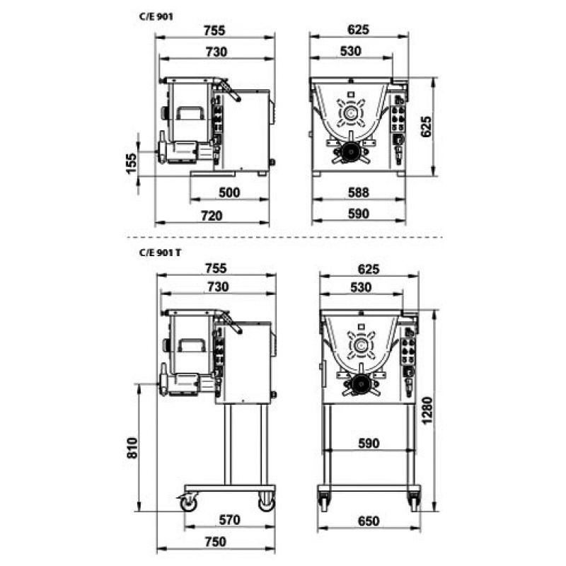 The body and outer head of the La Minerva C/E 901 T meat grinder are made of stainless steel for durability and hygiene. Equipped with a start-stop-reverse function for ease of use. Unger S5 knife system with three stainless steel plates and two knives for different types of meat cutting. The CE version complies with safety and quality standards. Equipped with 2 independent motors with a reverse function. Easily removable cutting system and loading hopper for easy cleaning. Auger throat: 32/98 mm. Accessories are also available for an additional fee: - Foot pedal, - Tilt shelf, - Sauce filler, - 95 l trolley, - Semi-automatic hamburger attachment, - Hamburger attachment, - Semi-automatic hamburger maker. This La Minerva C/E 901 T industrial meat grinder with mixing device is ideal for professional kitchens, providing high performance, reliability and ease of maintenance.Specification