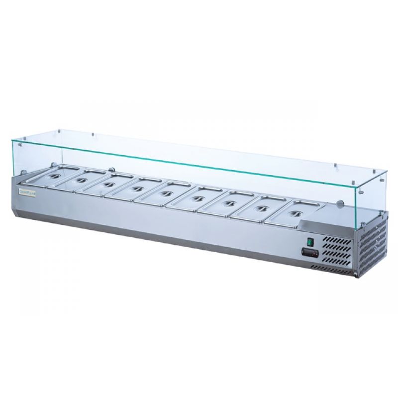 Main characteristics Refrigerated display case for topping GoodFood GF-VRX2000/380-H6C. Body color - Grey, Body material - Stainless steel, Control Panel - Digital, Cooling type - Static, Country of origin - China, Equipment type - Refrigerated display case, Glass type - Direct, Gross weight, kg - 64, Installation type - Desktop, Net weight, kg - 49, Power supply - Electricity, Power, kW - 0.11, Size - 2000x395x435, Supply voltage, V - 220, Temperature conditions, C - +2...+8, Tray dimensions - 9xGN1/3, Warranty period, months - 12, other specifications by phone: +38(067) 5710158.