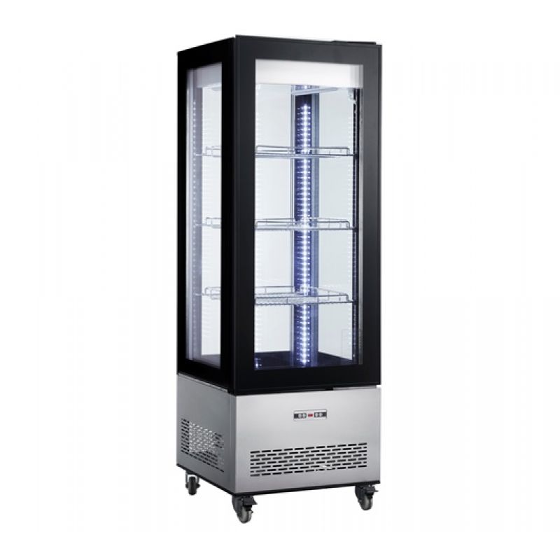 Introducing the GoodFood RT400L refrigerated display case . This floor-standing display case has a capacious capacity of 400 liters and is equipped with three chrome shelves that allow you to conveniently place and effectively present your desserts. The elegant black case of the display case harmoniously combines with durable side double glasses and a stainless steel base, ensuring reliability and durability of use. Four side glasses not only add aesthetic appeal, but also provide maximum visibility of the exhibited products, attracting the attention of buyers from all sides. For ease of movement, the display case is installed on 4 wheels, two of which are equipped with brakes, which guarantees stability and safety during use. Internal LED lighting, located on four sides, brightly and evenly illuminates the entire display case, emphasizing the freshness and beauty of your confectionery masterpieces. The digital control panel provides easy adjustment of the temperature from 0 to +12 C, which is ideal for storing various types of desserts. The ventilated cooling system and automatic defrosting guarantee uniform temperature distribution and no ice, and the safe R290 refrigerant makes the display case environmentally friendly. The display case is supplied in reliable packaging measuring 740x740x2050 mm with a plywood pallet, which ensures safe transportation.Specification
