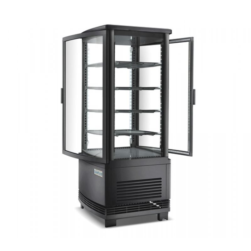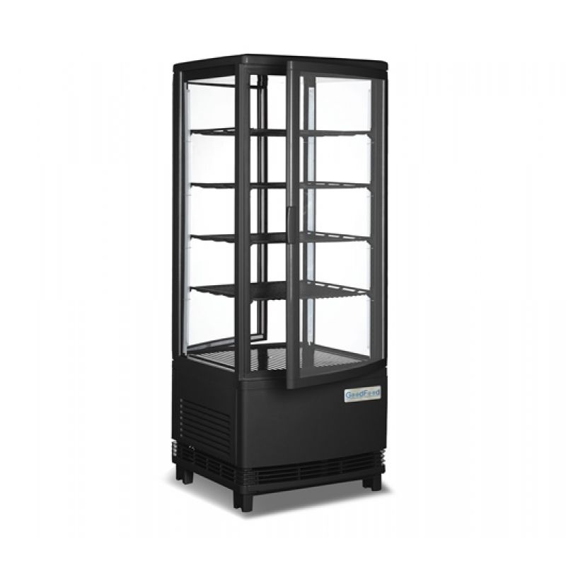Refrigerated display case GoodFood RT98LR2 for displaying soft drinks and confectionery. The case is made of high-quality plastic in a stylish black color, which gives the device an elegant and modern look. The chamber volume is 98 liters, providing enough space for storing products. The set includes 4 height-adjustable shelves and a non-removable lower shelf, which allows you to flexibly configure the interior space. Features of GoodFood RT98LR2 include a two-way door opening and two-sided side LED lighting that effectively illuminates the contents of the display case. Chrome shelves add sophistication, and the digital control panel makes setting the temperature from 0 to +12 C simple and convenient. Dynamic cooling with cold air circulation and an auto-defrost function ensure stable operation and safety of products. Environmentally friendly refrigerant R290. In the package, the dimensions are 480x480x1135 mm, and the weight is 36 kg, which provides additional protection during transportation. The GoodFood RT98LR2 refrigerated display case is a combination of functionality, style and reliability, ideal for your business.Specification