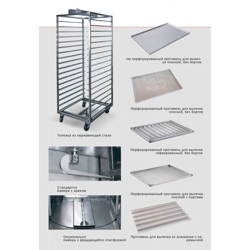 Rotary oven Forni Fiorini ROTOR The rotary oven is suitable for baking all types of bakery and confectionery products. Modern design, stainless steel design, convenient control, ease of maintenance and operation, uniform and high-quality baking are the main advantages of this equipment. High productivity is achieved by using baking sheets measuring 600 mm by 800 mm. The number of baking sheets may vary depending on the type of baked goods and customer wishes from 10 to 18 pcs on one trolley, the distance between the baking sheets, respectively, depends on their number. The standard package includes an exhaust visor, a powerful steam generator, a hook trolley mount, a door with double glass. Additional options include a programmable control panel, a fan speed variator, a platform. When installing the oven in production, the overall height of the oven should be taken into account - 2610 mm and a weight of 1600 kg. The distance between the baking sheets is from 86.5 to 156 mm.