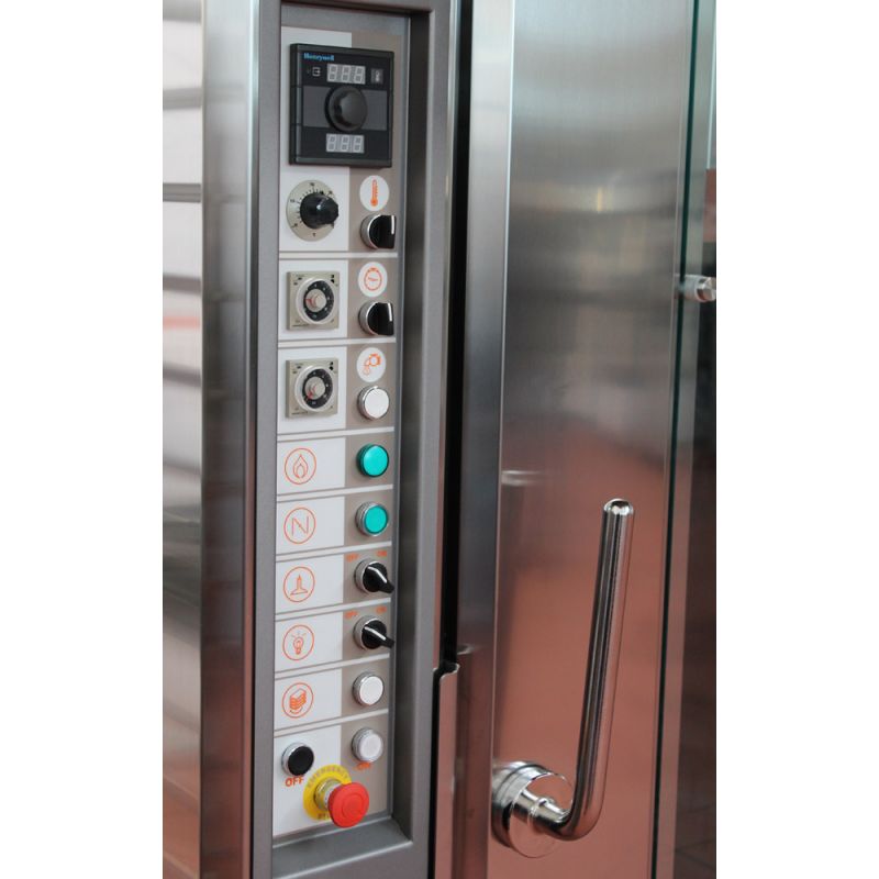 The special structure and combination of components minimize heat loss and optimize energy consumption. The result is maximum fuel savings for a more economical project. The Rotor 68 oven by Bassanina has perfect thermal insulation, where no toxic materials are used. A powerful steam device inside the baking chamber, which operates through a programmable timer system, provides sufficient steam for the most demanding applications, even during continuous operation. The oven can operate with gas or diesel burners, or with electrical energy. In addition, it is available in two versions: with a mechanical or with a digital programmable panel. Power supply is three-phase + neutral 230V or 400V, with a frequency of 50 or 60 Hz. Special power on request.