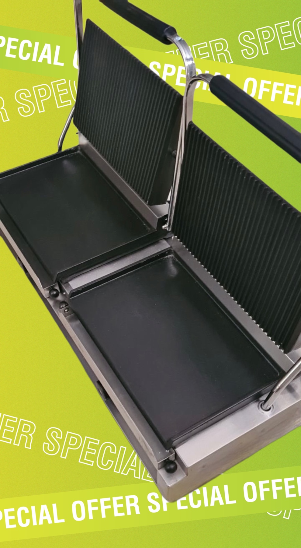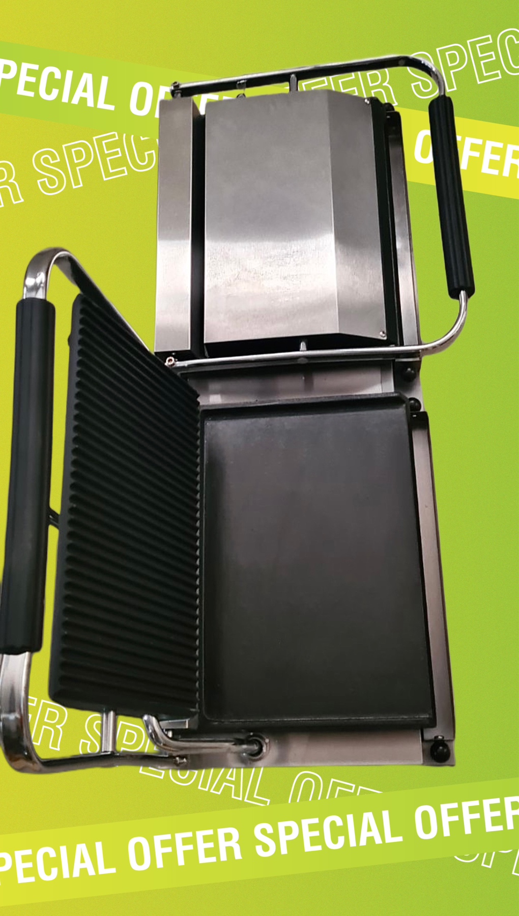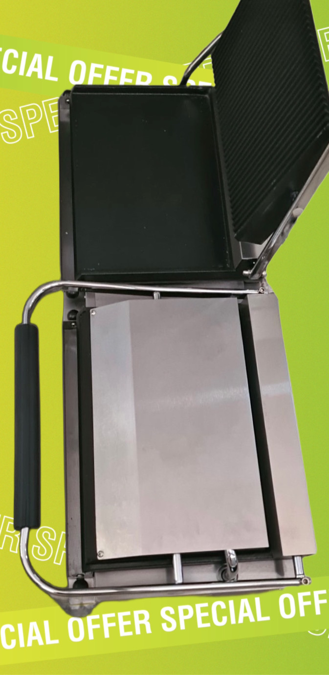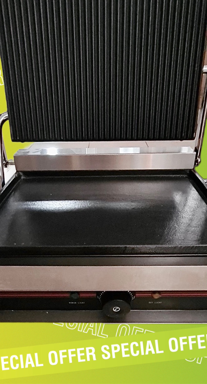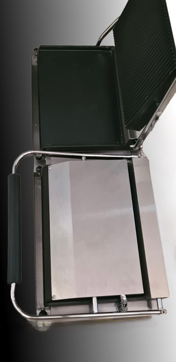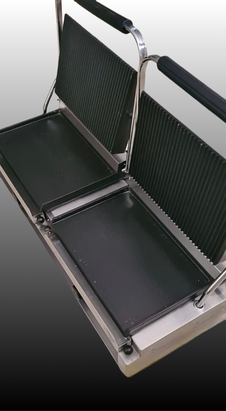 Puzdro - nerezová oceľ. Spodná pracovná plocha je 740x230 mm, dve horné plochy sú rebrované - 338x220 mm. Rozsah teplôt od 50 do 300 C. Kontrolná lampa ohrevu. Nádrž na zber tuku.