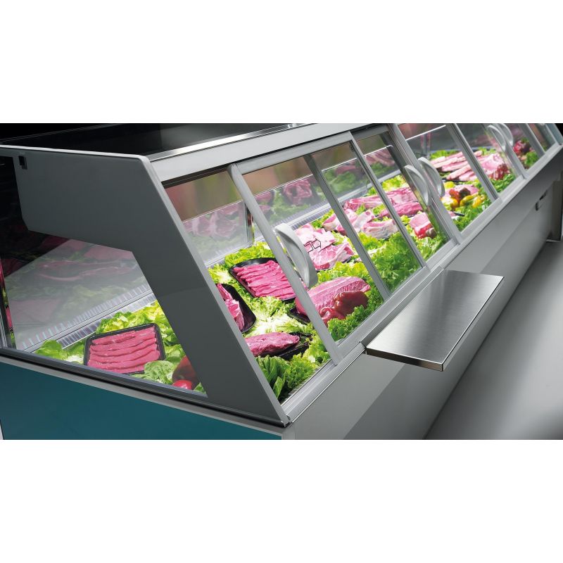 Táto vitrína je vybavená statickou chladiacou doskou so stropnou špirálou, ktorá poskytuje vyššiu úroveň vlhkosti vo vnútri chladeného priestoru ako tradičné vetrané pulty. Medzi ďalšie štandardné prvky patrí hranatá predná časť so zdvíhacím predným sklom, dvojité presklené koncové panely a zadné posuvné dvere a dva rady LED osvetlenia pod hornou cievkou.