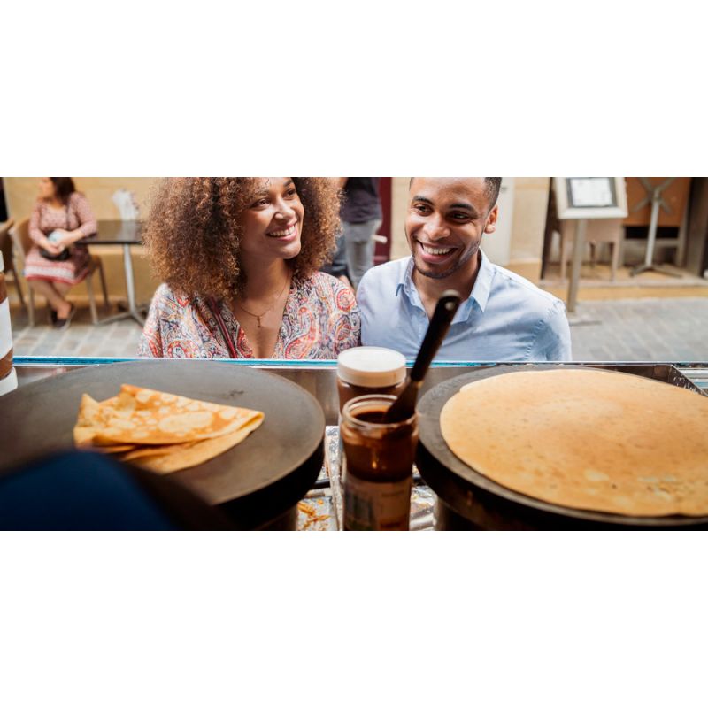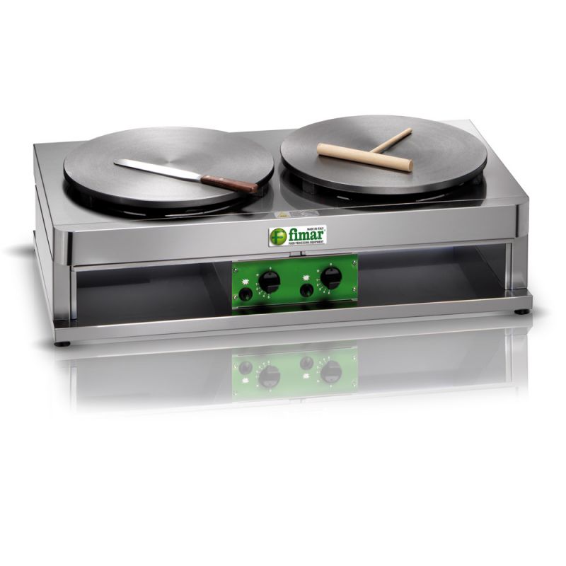 Plynový palacinkovač Fimar CR400G2 je typ profesionálneho zariadenia do reštaurácií a kaviarní, určený na vyprážanie palaciniek. Talianska spoločnosť Fimar vyrába kvalitné palacinkovače, vyznačujúce sa intenzitou ohrevu a kvalitou pečenia palaciniek s minimálnym množstvom tuku. Panvica na palacinky Fimar CR400G2 je vyrobená na dvoch a umožňuje smažiť palacinky súčasne na dvoch vyprážacích plochách. Plochy na vyprážanie s priemerom 400 mm sú vyrobené z pieskovanej liatiny. Sú potiahnuté špeciálnym povlakom, ktorý zaisťuje ekonomické využitie tuku. Povrch panvice na palacinky je opatrený zárezmi, ktoré zabraňujú kĺzaniu palacinky po povrchu. Teplota ohrevu sa reguluje samostatne pre každý povrch pomocou 8-polohového regulátora plameňa. Horáky sa zapaľujú piezoelektrickým zariadením. Telo výrobku je vyrobené z nehrdzavejúcej ocele. Nohy sa dajú výškovo nastaviť.