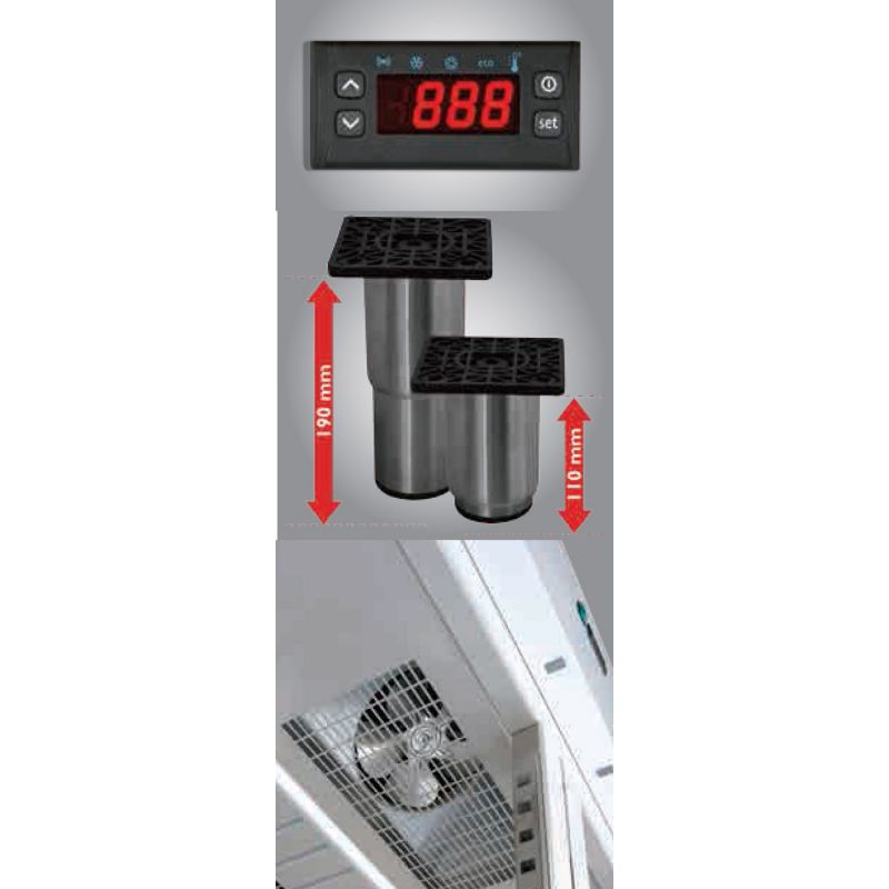 Dvere - nerez. Relatívna vlhkosť - 65%. 12 vodidiel z nehrdzavejúcej ocele. 6 plastových políc GN2/1. Chladivo - R452A.