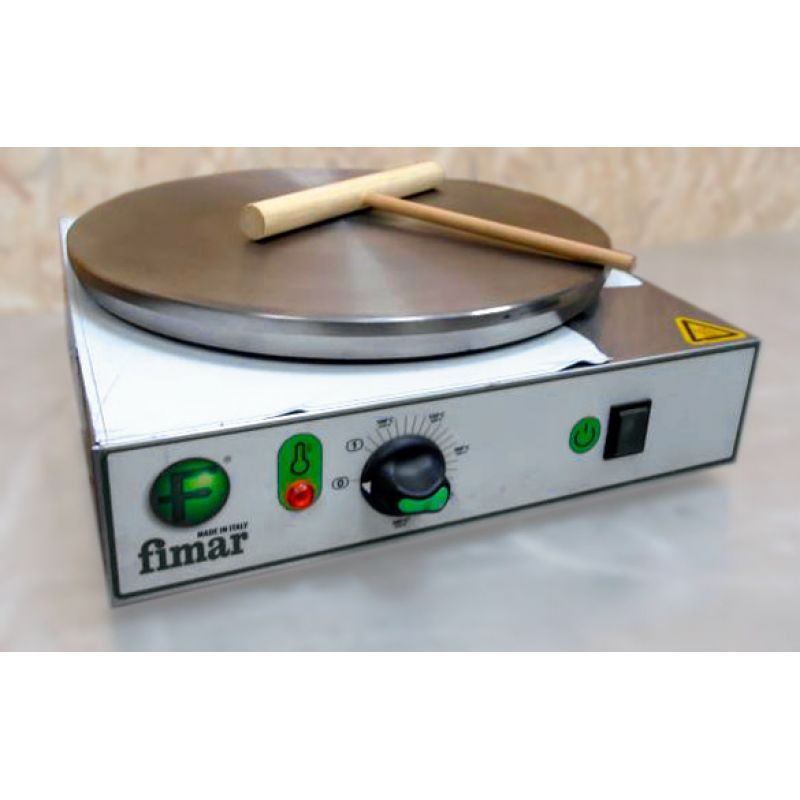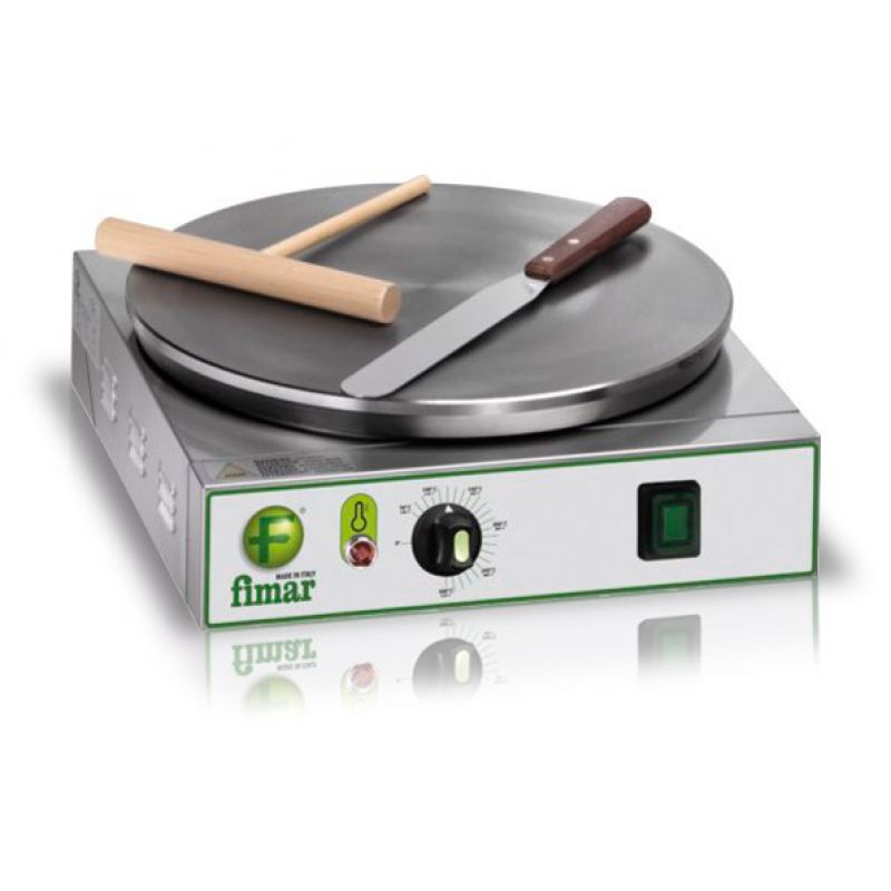 Krepovačky od renomovanej talianskej výrobnej spoločnosti Fimar , ktorá pôsobí v oblasti profesionálneho kuchynského vybavenia už viac ako 35 rokov a je široko známa svojím vedeckým vývojom a technológiami, plne spĺňajú požiadavky najvyšších kvalitatívnych štandardov na vybavenie svojej triedy. Ich vysoká produktivita, hospodárnosť, jednoduchosť dizajnu a hlavne kvalita palacinkových výrobkov sa potvrdili na medzinárodných výstavách kuchynského vybavenia. Pracovnou základňou tohto modelu je plocha na vyprážanie, na ktorej sa priamo pečú palacinky. Vyrobený z pieskovanej liatiny s protišmykovým zúbkovaním na povrchu, zahrieva sa rovnomerne po celej ploche a šetrne využíva tuk. Vďaka tomu sa palacinky upečú efektívne po celej ploche horáka. Teplota pečenia je regulovaná termostatom, umožňuje jej nastavenie v rozmedzí od 50 do +300 C. Rám palacinkára je vyrobený z nerezovej ocele. Jeho nízka hmotnosť umožňuje použitie zariadenia na vonkajšie a pouličné obchodovanie, v stanoch a na prívesoch.Špecifikácia