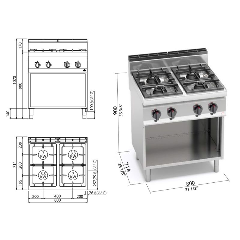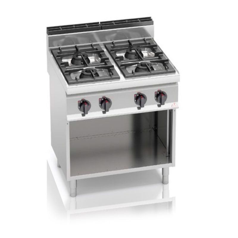 4-horákový plynový sporák Bertos G7F4MP je typom profesionálneho kuchynského zariadenia používaného na varenie, vyprážanie a iné druhy tepelnej úpravy potravinárskych výrobkov. Bez tohto profesionálneho vybavenia, ktoré zabezpečuje bezproblémový chod horúcej predajne, si len ťažko vieme predstaviť fungovanie akéhokoľvek stravovacieho zariadenia. Rozmery plynového sporáka G7F4MP uvedené v katalógu podľa deklarácie výrobcu sú: dĺžka – 800 mm, hĺbka – 700 mm, výška – 900 mm. Výkon horáka je 7 kW. A tvar horákov je okrúhly. Poskytovaný počet výhrevných telies je 4. Konštrukcia plynového sporáka spĺňa normy. A čo je dôležité, takýto plynový sporák sa ľahko používa, ovládanie je mechanické, spotreba plynu je 2,9 m3 /h