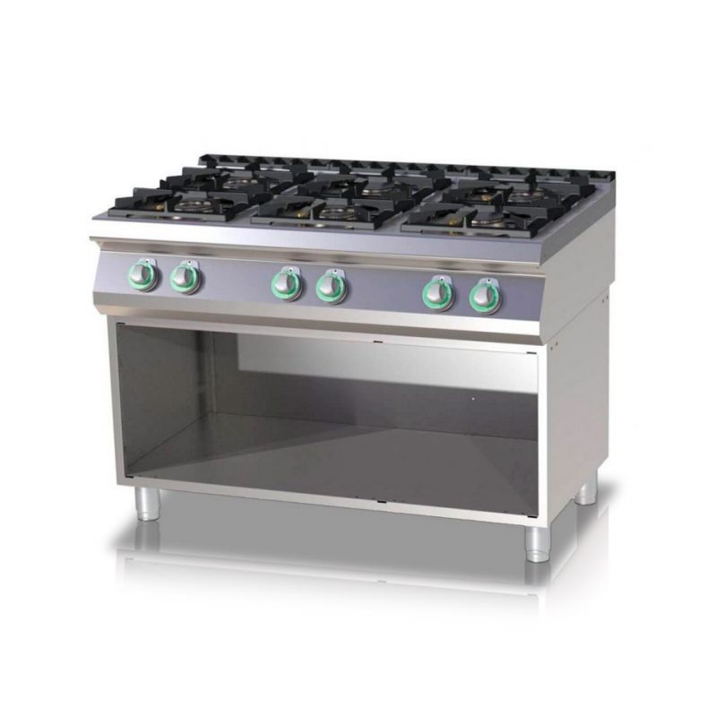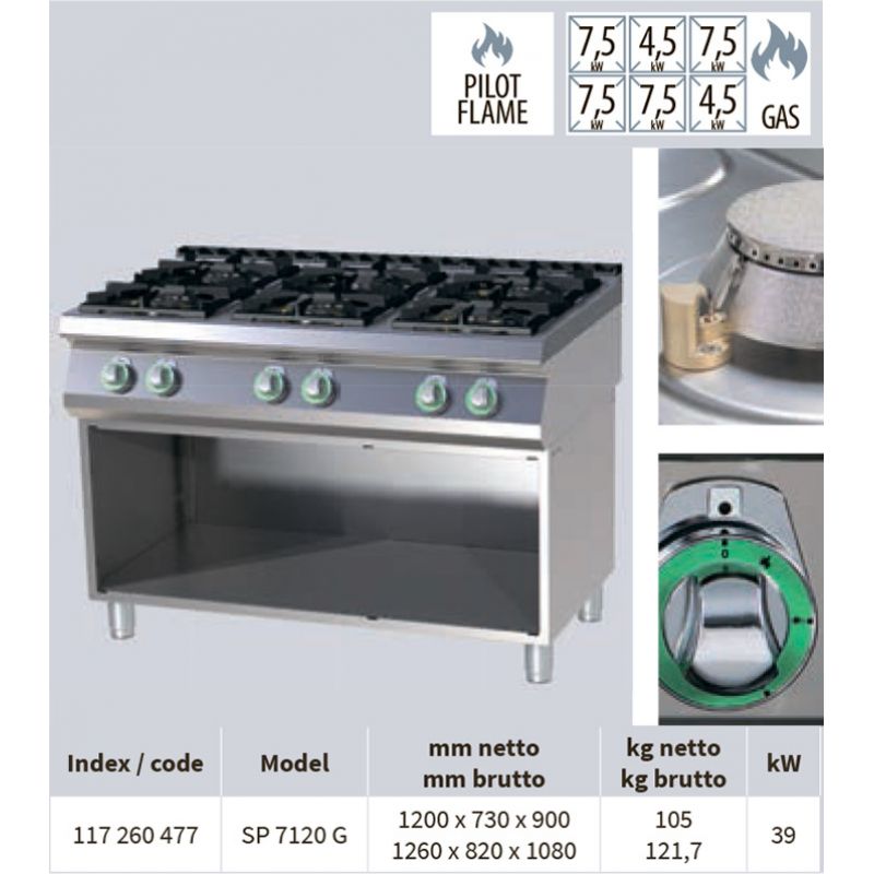 Plynový sporák RM GASTRO SP 7120 G stojaci, 6-horákový. Výkon horáka: (2*4,5)+(4*7,5) kW. Dvojplatnička 2 x 4,5 + 4 x 7,5 kW na stojane , dvierka voliteľné . Odolné liatinové vysokoúčinné horáky . Prepadová priehlbina . Rozmery 1200 x 730 x 900 mm. Hmotnosť 105 kg. Výkon 39 kW.