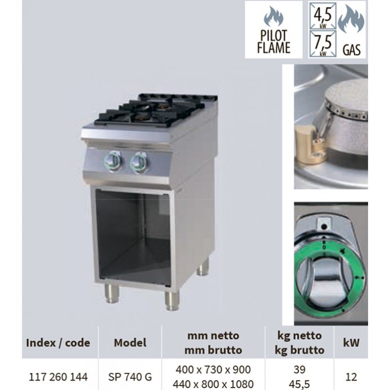 Plynový sporák RM GASTRO SP 740 G stojaci, 2-horákový. Výkon horáka: 4,5+7,5 kW. Varná doska 4,5 + 7,5 kW na stojane , voliteľne dvierka . Odolné liatinové vysokoúčinné horáky . Prepadová priehlbina . Rozmer 400 x 730 x 900 mm. Hmotnosť 39 kg. Výkon 12 kW.