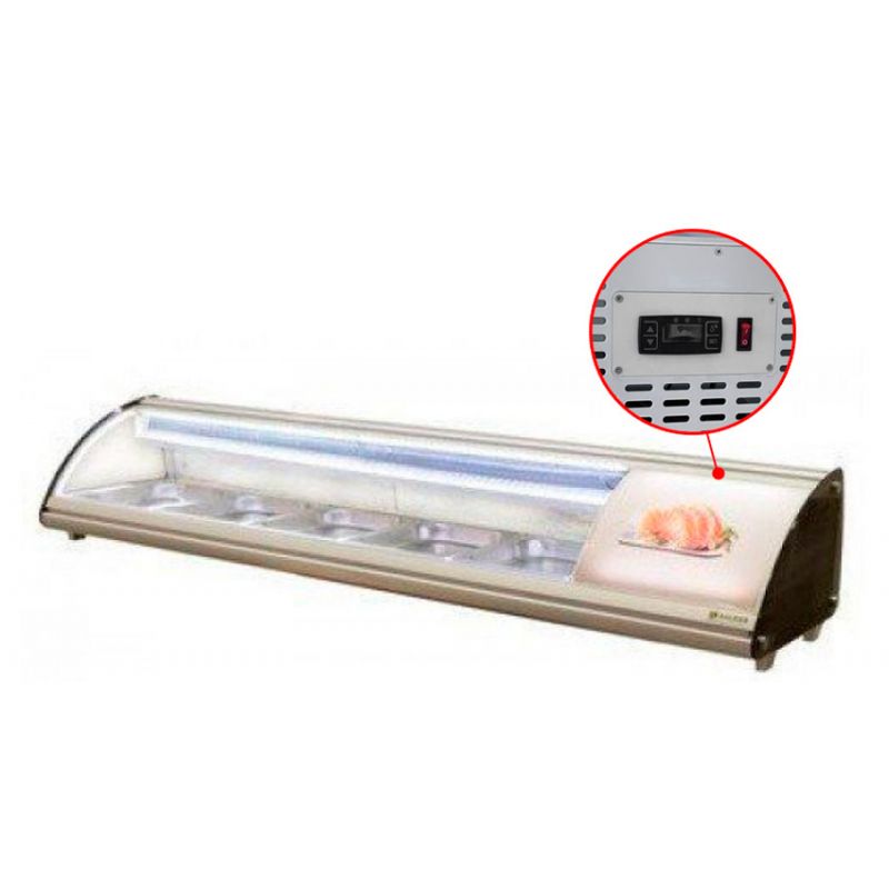 Sushi kufrík je nepostrádateľným prvkom v kuchyni každej reštaurácie. Prezentovaný model vybavenia má funkciu podsvietenia a mnoho ďalších užitočných doplnkov. Puzdro na sushi je vyrobené z nehrdzavejúcej ocele a plastu, vďaka čomu je odolné. Jeho prevádzková teplota je od +4C do +10C. Pomocou displeja môžete ovládať teplotu a v prípade potreby ju meniť. V našom internetovom obchode si môžete zakúpiť prezentované vybavenie za cenu, ktorá je niekoľkonásobne nižšia ako trhové ceny.Špecifikácia
