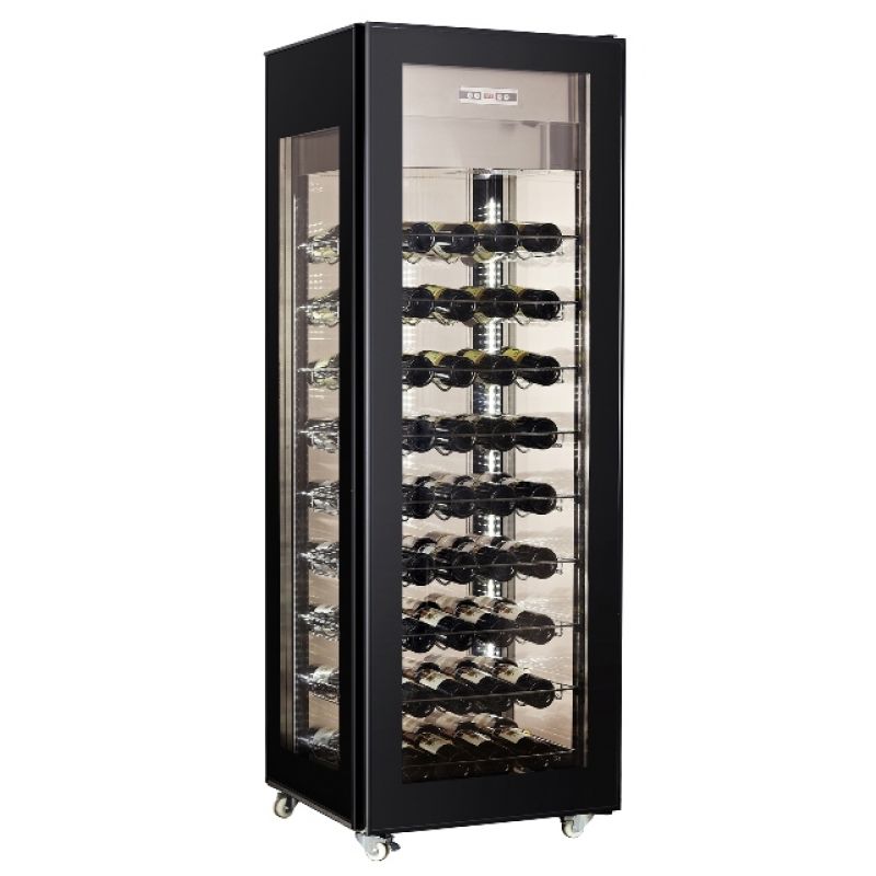 Chladiaca vitrína na víno GoodFood RT400L2 je určená na uloženie a vystavenie vášho sortimentu vín. Tento elegantný spotrebič s čiernym plastovým telom a objemom 400 litrov poskytuje optimálne skladovacie podmienky až pre 81 fliaš vína na 9 chrómových poličkách. Vitrína je vybavená štvorstranným LED osvetlením, ktoré vám umožní efektívne prezentovať vašu kolekciu. Pre jednoduchosť používania je vitrína vybavená digitálnym ovládacím panelom a dvojitým sklom so zrkadlovým odrazom. Pevný rám na štyroch kolesách, z ktorých dve sú s brzdou, umožňuje jednoduché presúvanie vitríny po miestnosti. Kompresor umiestnený na vrchu zabraňuje poškodeniu spôsobenému zvyškami jedla a zabezpečuje výmenu studeného a horúceho vzduchu zhora, čím eliminuje potrebu ďalšieho priestoru okolo jednotky. Teplotný rozsah od 5 do 18 C a regulácia teploty udržujú konštantný chlad počas celej sezóny, simulujúc podmienky prírodnej vínnej pivnice. Vitrína funguje na bezpečné chladivo R290, čo z nej robí riešenie šetrné k životnému prostrediu. Zbalená vitrína má rozmery 740x740x2050 mm a váži 204 kg. Výberom chladiacej vitríny GoodFood RT400L2 zabezpečíte, že vaše vína budú uchovávané v ideálnych podmienkach a prezentované štýlovo podľa najvyšších štandardov.Špecifikácia